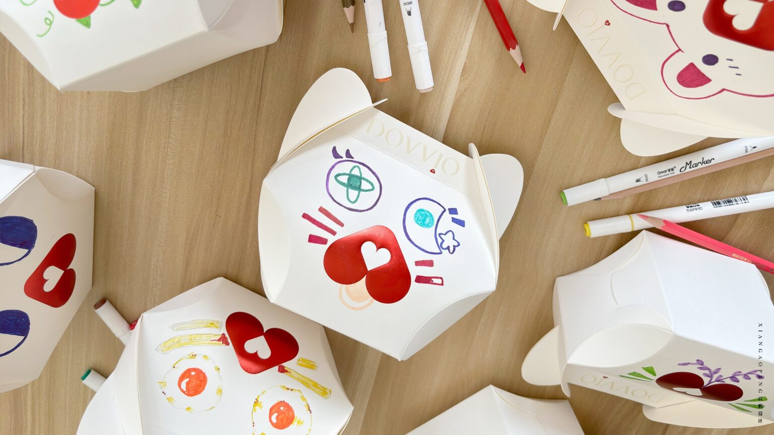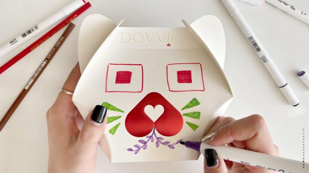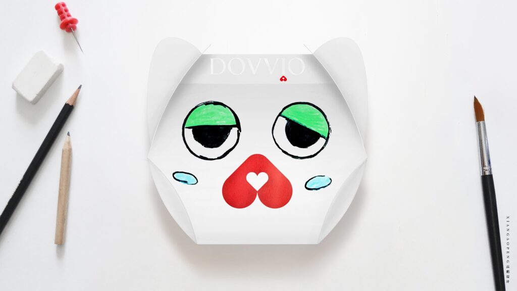 DOVVIO, a Japanese pet cat food brand, is actively working to enhance its product and brand visibility. In 2024, we are set to introduce promotional items, including freeze-dried and canned pet food, in physical stores across Tokyo. To optimize costs and align with project requirements, we devised a cat-shaped structural packaging box adorned with the brand’s logo graphics (without adhesive). This innovative design encourages consumers to express themselves freely by drawing pictures or creating personal logos in the designated blank spaces on the box.