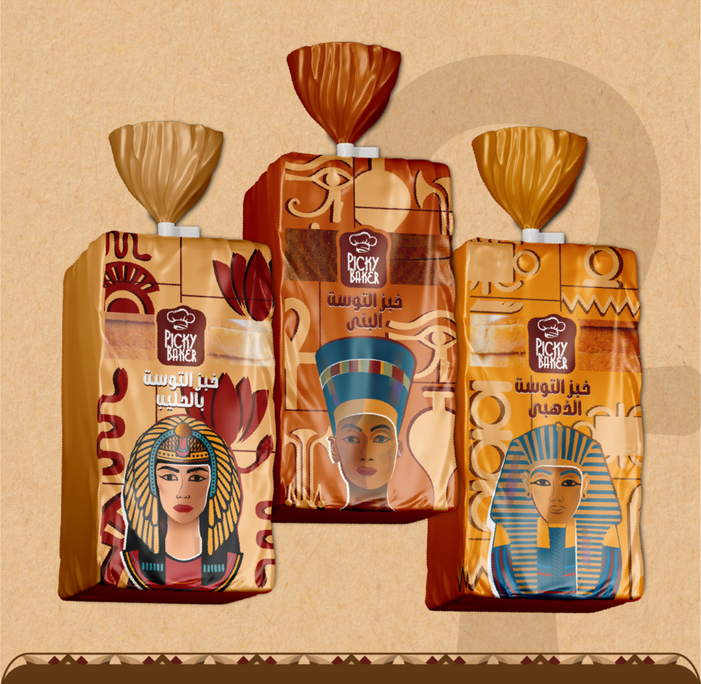 The designs are based on the Egyptian identity, especially the period of the pharaohs, where we go back to the period of bread-making in ancient Egypt 5800 years ago from low-gluten wheat and took King Tutankhamun, Cleopatra and Nefertiti as the main characters.
