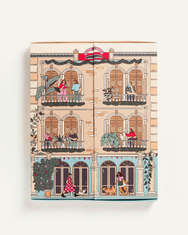 One coffee per day you’ll get into a cozy reminiscent of grandparents’ house, filled with warmth and charm that made those visits so special. This calendar is more than just a countdown; it’s a journey through the heart of familial nostalgia. The external box captures the essence of a typical colonial house in Guayaquil, with details like people sipping coffee on balconies, strolling with their furry friends, or immersed in the morning paper. Inside, you’ll find illustrated compartments, inspired by the beloved spaces from grandparents’ home and decor that reflects the essence of family, in the back there’s information about the origin of coffee, 12 varieties for 12 days. Every detail of this packaging is designed to evoke feelings of love and nostalgia.