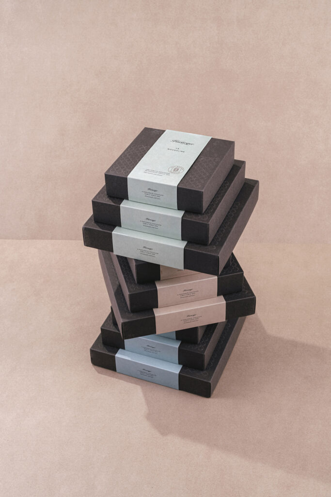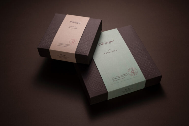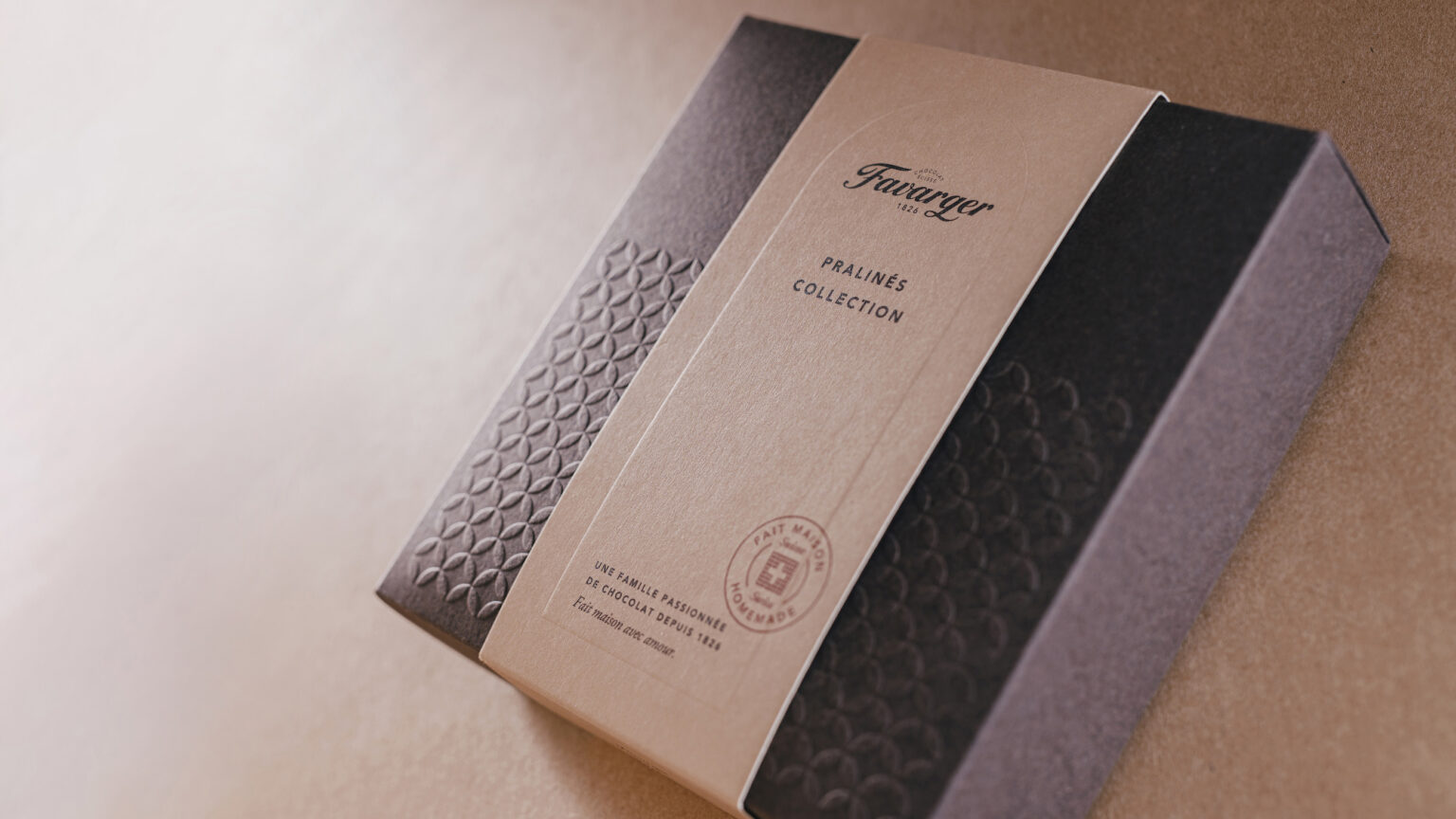 The Favarger brand espouses a “passionate chocolate family,” emulated by the brand’s signature and seal impressions on every single piece of packaging, including unassuming cellophane bags as well as luxury praline boxes.