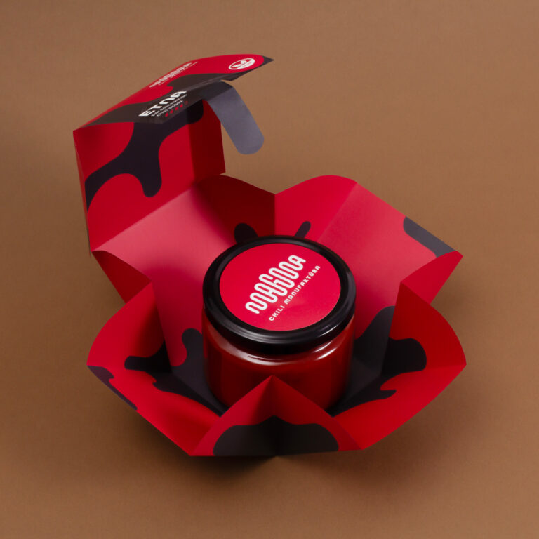 The packaging was designed with the eco-friendly thinking in mind, so the box is designed to be assembled without glue and folded down to give it another function to pour your snack into for dipping. The contents of the box is an unlabelled jar, so we can easily recycle it and fill it with our own contents. Only the lid of the jar has a sticker with the logo in the product colour. The outer packaging has been given the colour of the product, in addition to the basic grey colour.