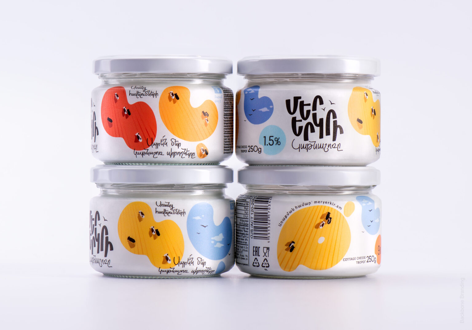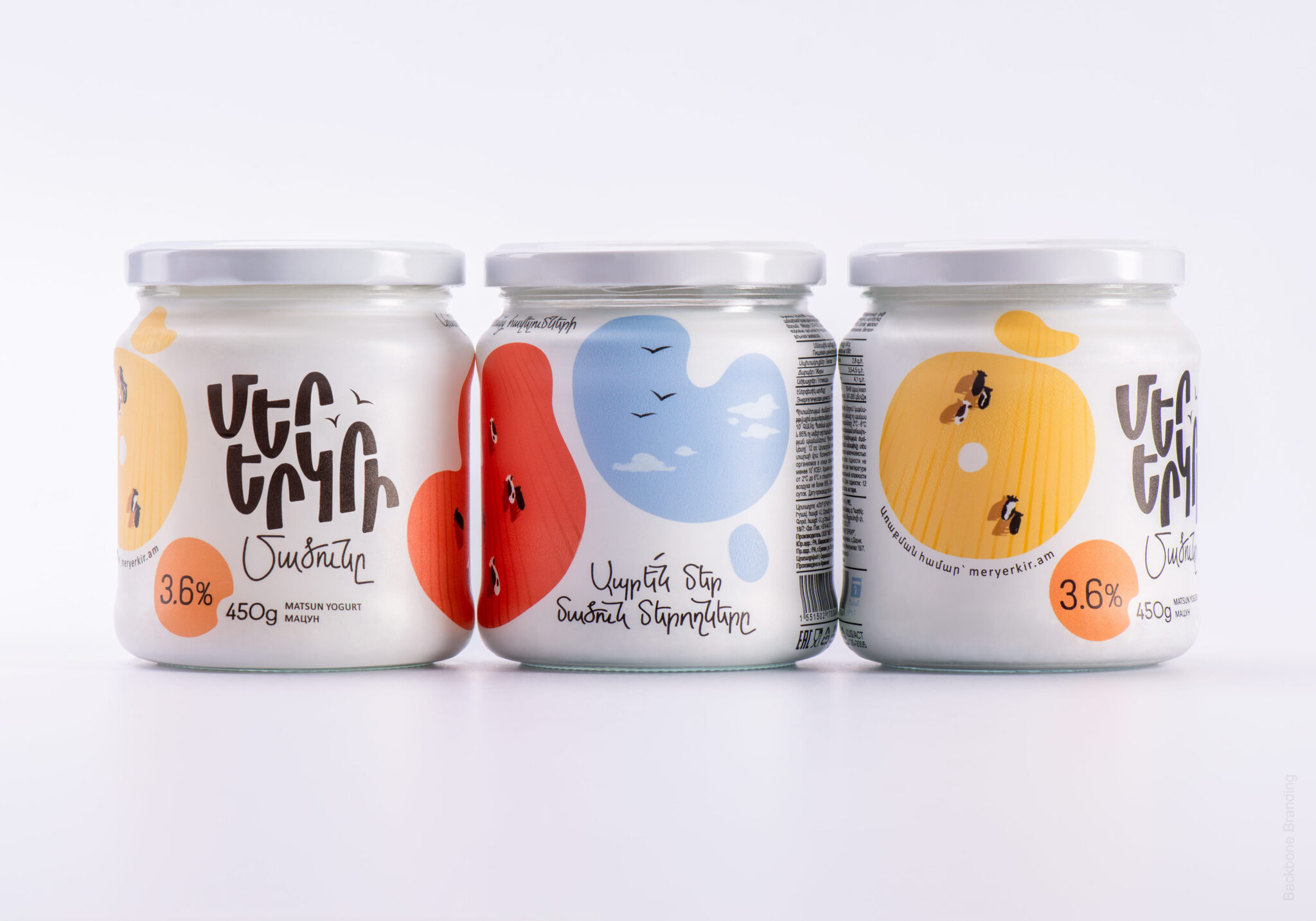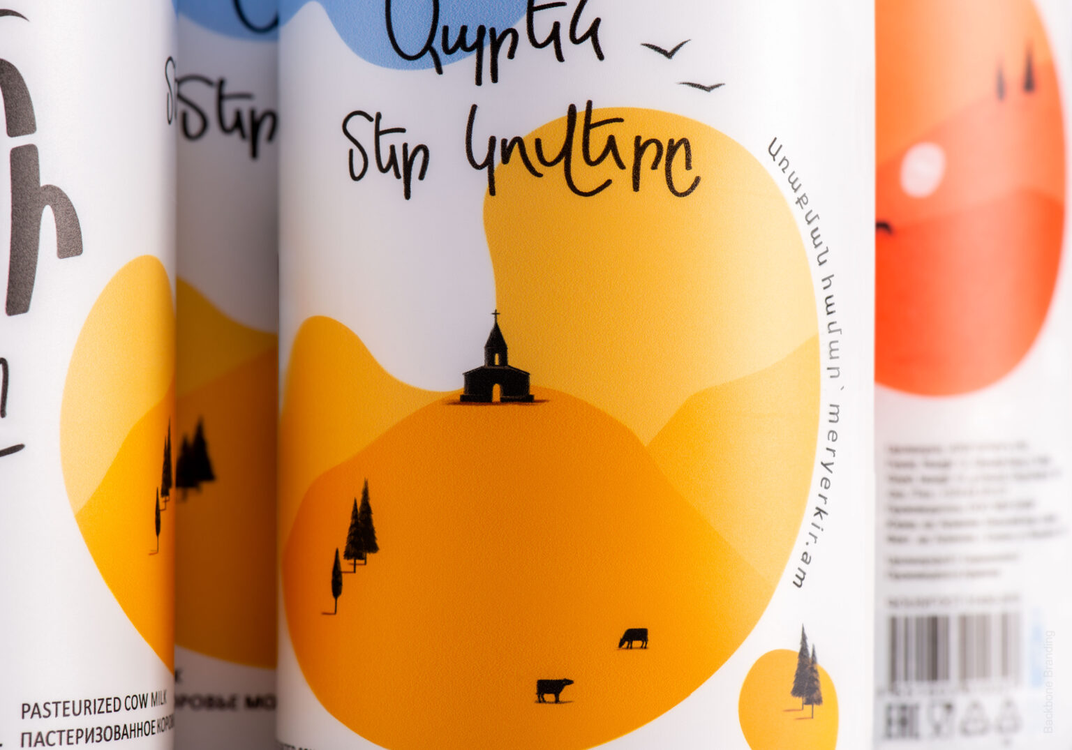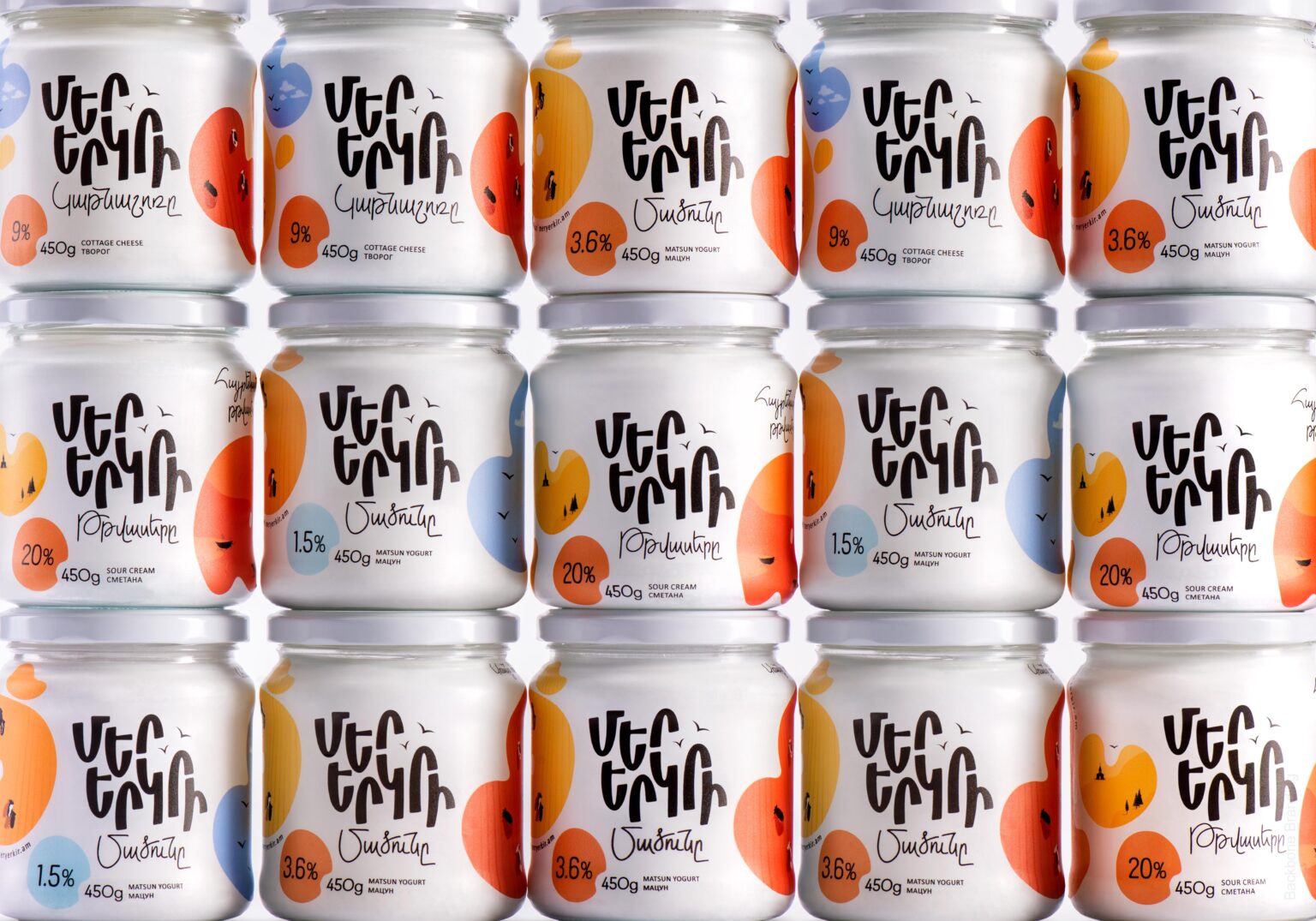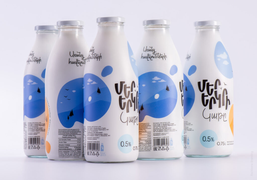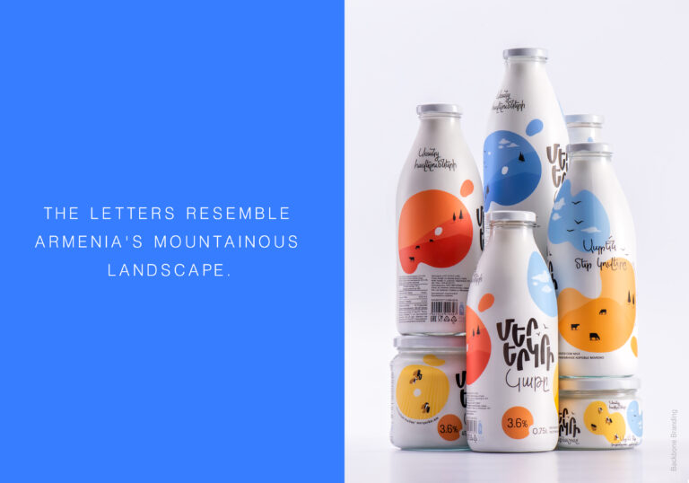 “Mer Yerkir,” meaning “Our Land” in Armenian, produces a range of dairy products with patriotic and playful branding. The colorful labels feature different shades of the Armenian flag: red, blue, and orange, making the brand highly recognizable.