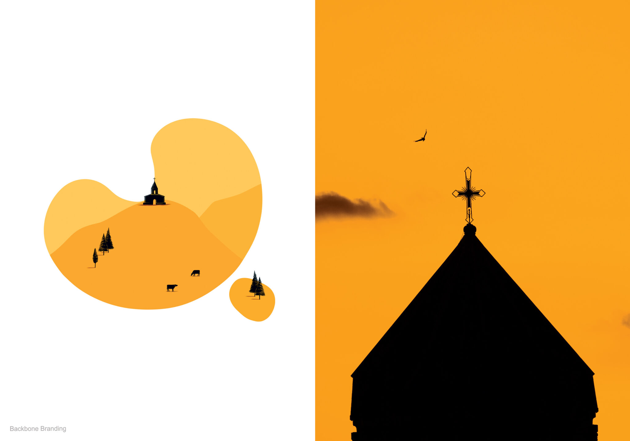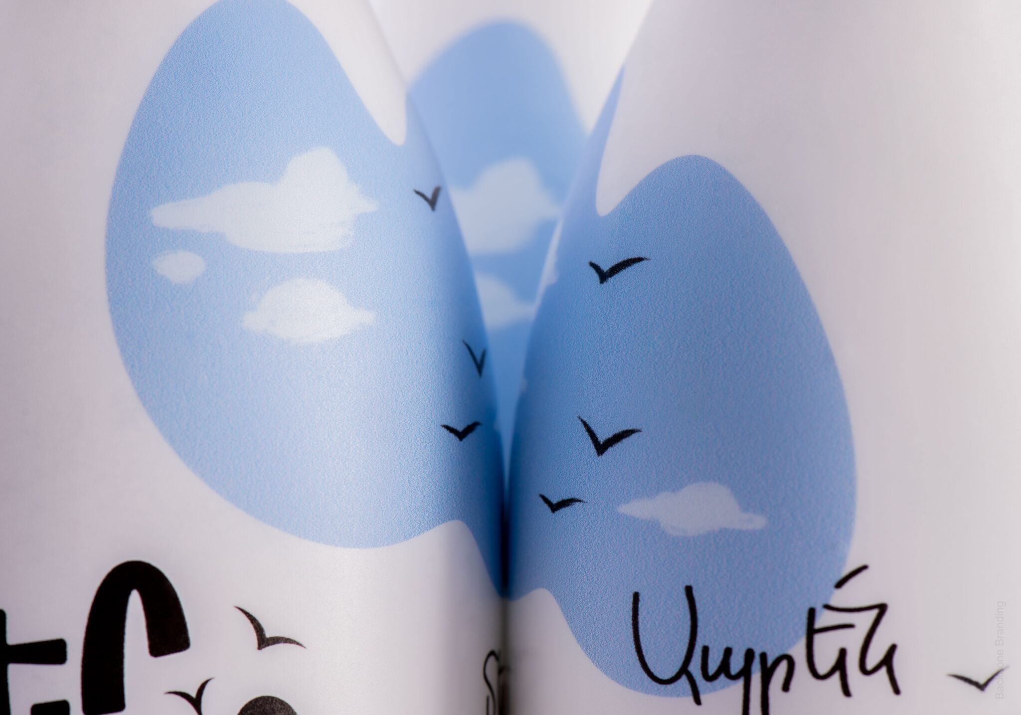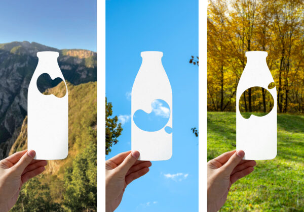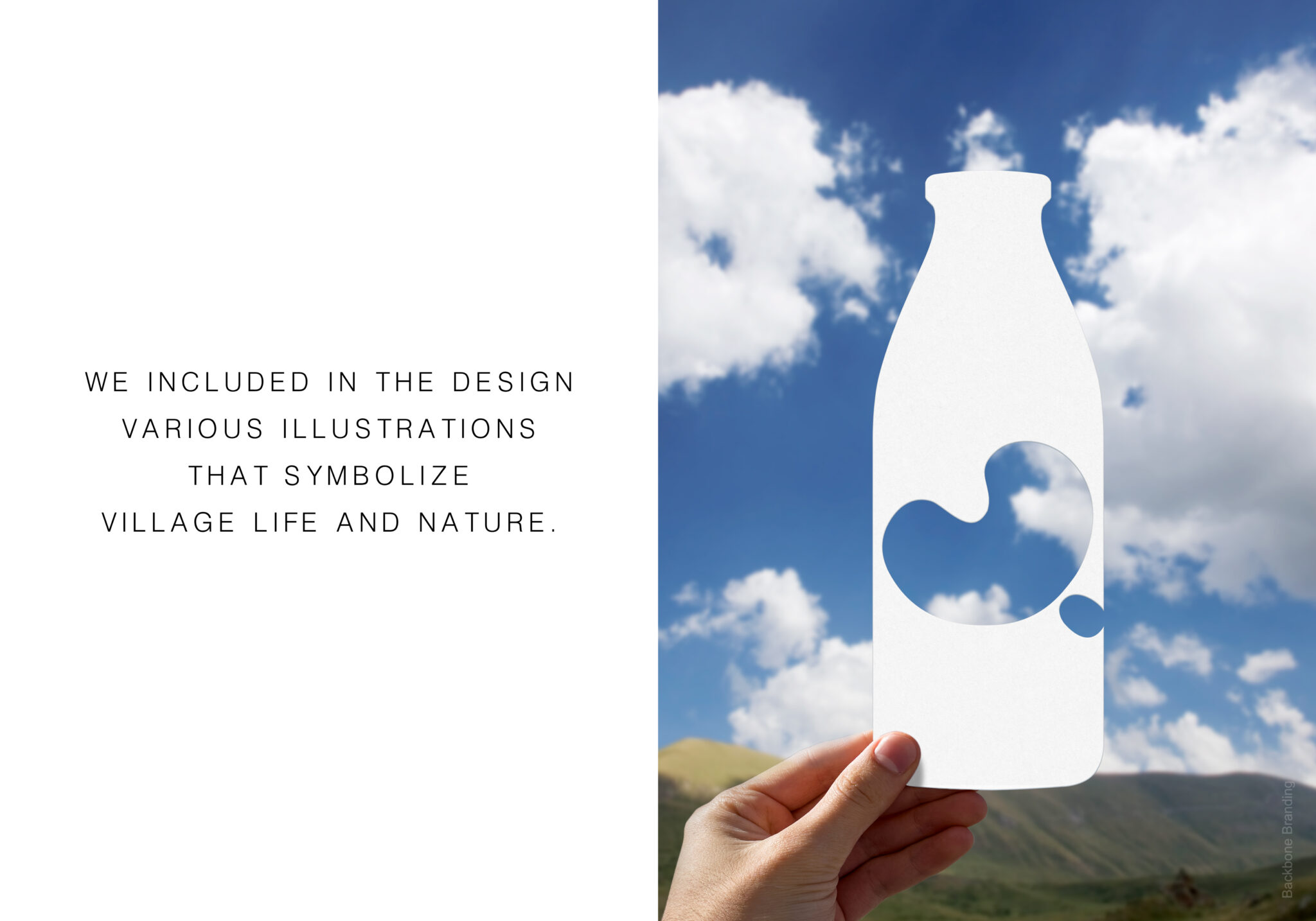 We achieved this by including various illustrations that symbolize village life, including cows, crop fields, agricultural machinery, churches, birds, and blue skies. Unlike the previous design, the “letter-spots” are now evenly distributed around the surface of the bottle, making the product easily recognizable from any angle on a supermarket shelf or in a fridge.