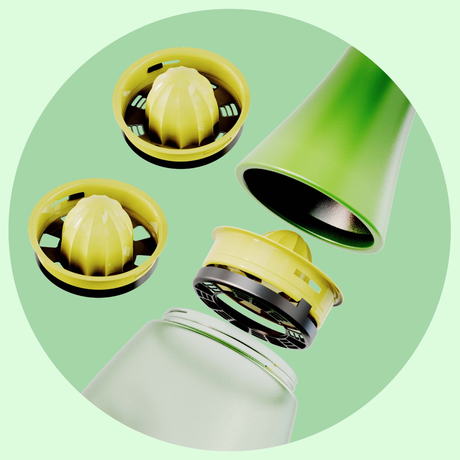- The bottle consists of four main parts (from the bottom in order): frosted glass container (according to the required conditions of lime juice storage), manual lime juicer cap which allows to adjust the size of the liquid inlet slots using the lever next to it (practical packaging), easy liquid lid (for ease of use) and the main bottle cap.