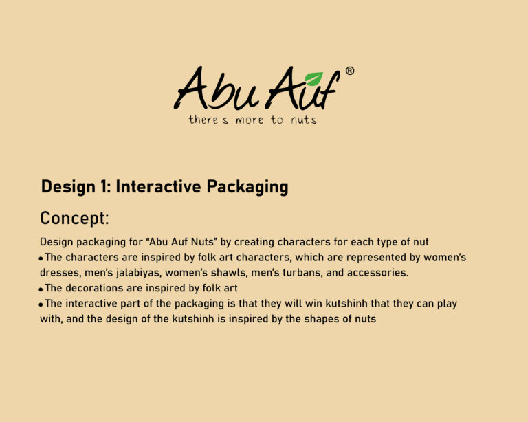 - Designing the packaging for “Abu Auf Nuts” by creating designs using a mandala containing popular motifs and nuts according to each type and combining nuts with these popular motifs.