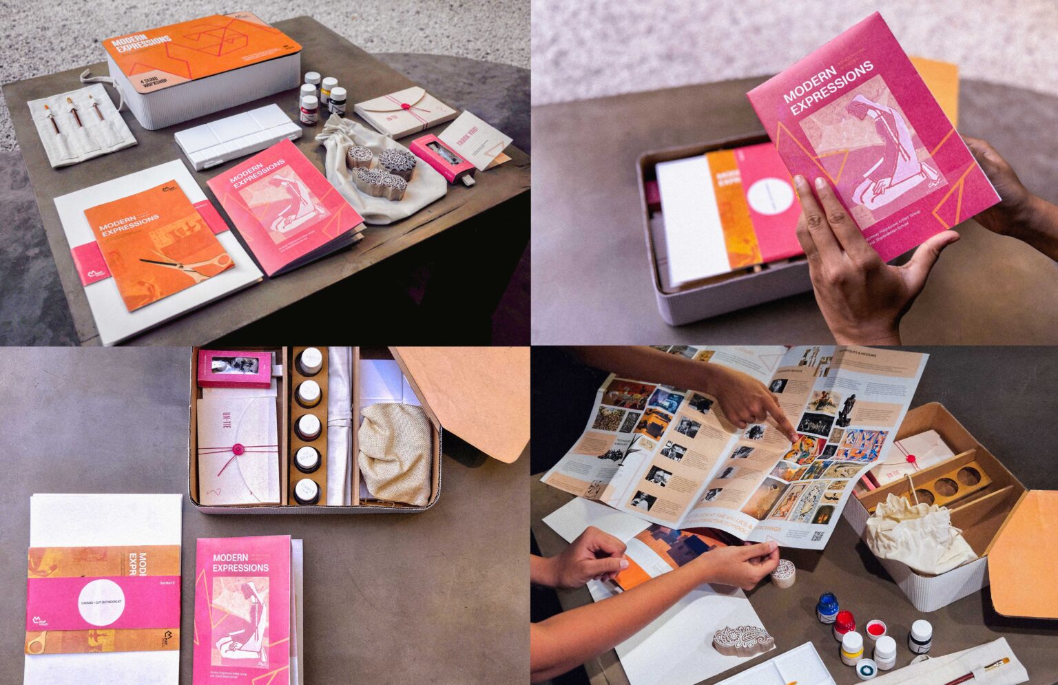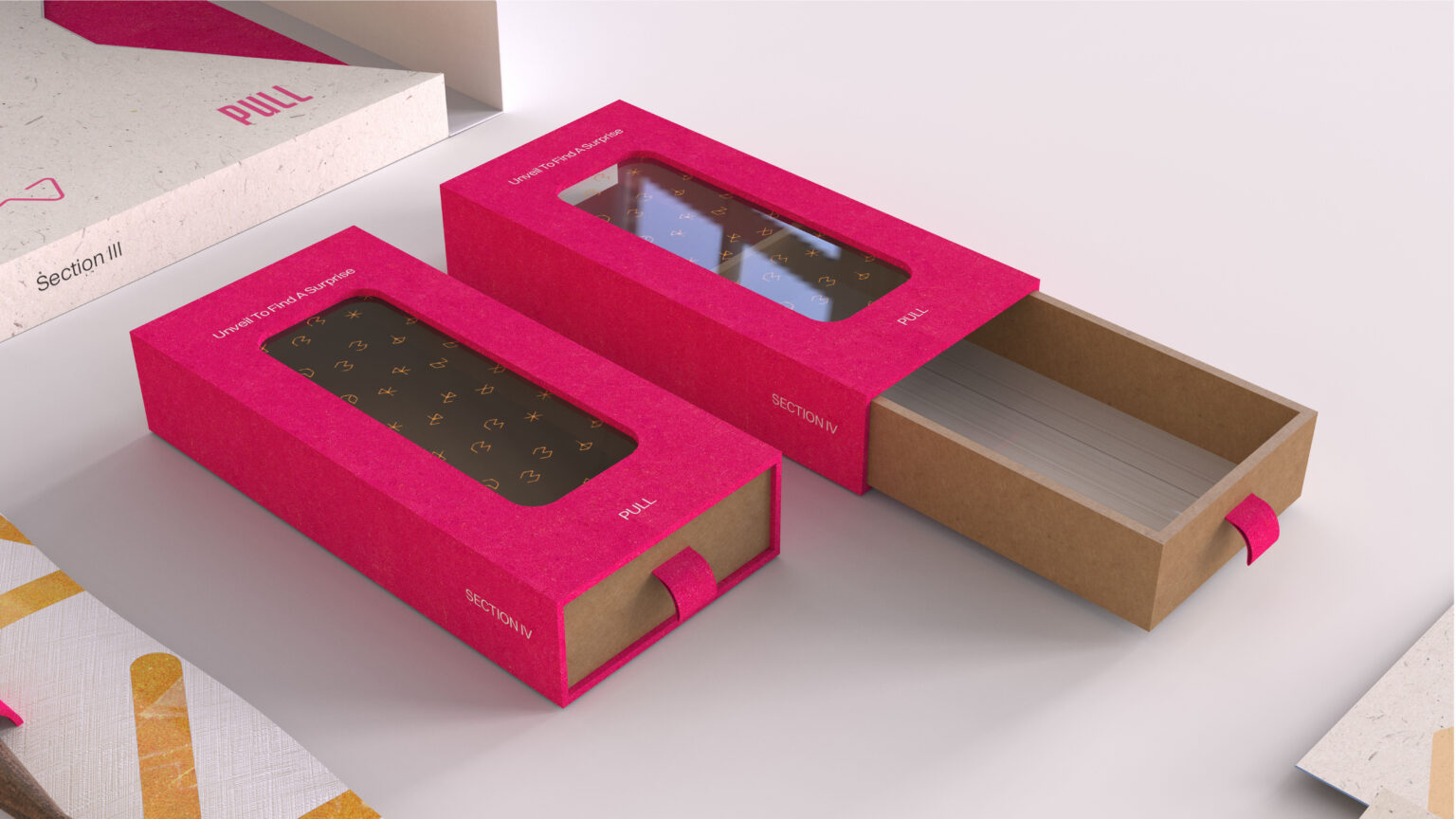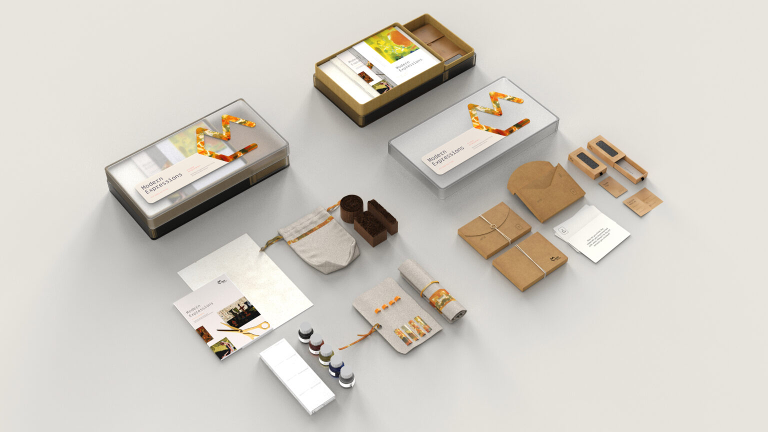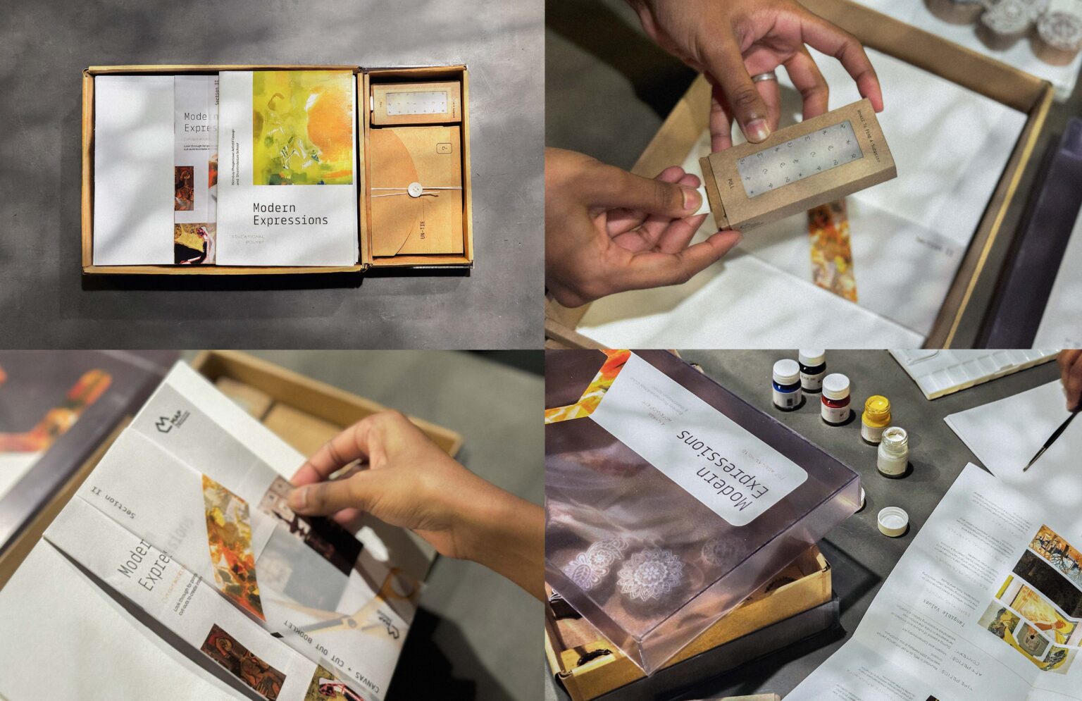 We have developed two kits based on two different themes, which are derived from the holistic essence of MAP in terms of its environment, mood, and visual interaction, along with the fundamental principles of Indian art. The two themes are Tactile Minimalism and Expressive Voices, respectively. The package of tactile minimalism, with subtle visual language, consists of elements of transparency and materials such as frosted acrylic, cardboard, and vellum paper. Whereas the package of Expressive Voices, with a vibrant constrasting language includes paper-based materials like cardboard, craft paper, and mill-board.