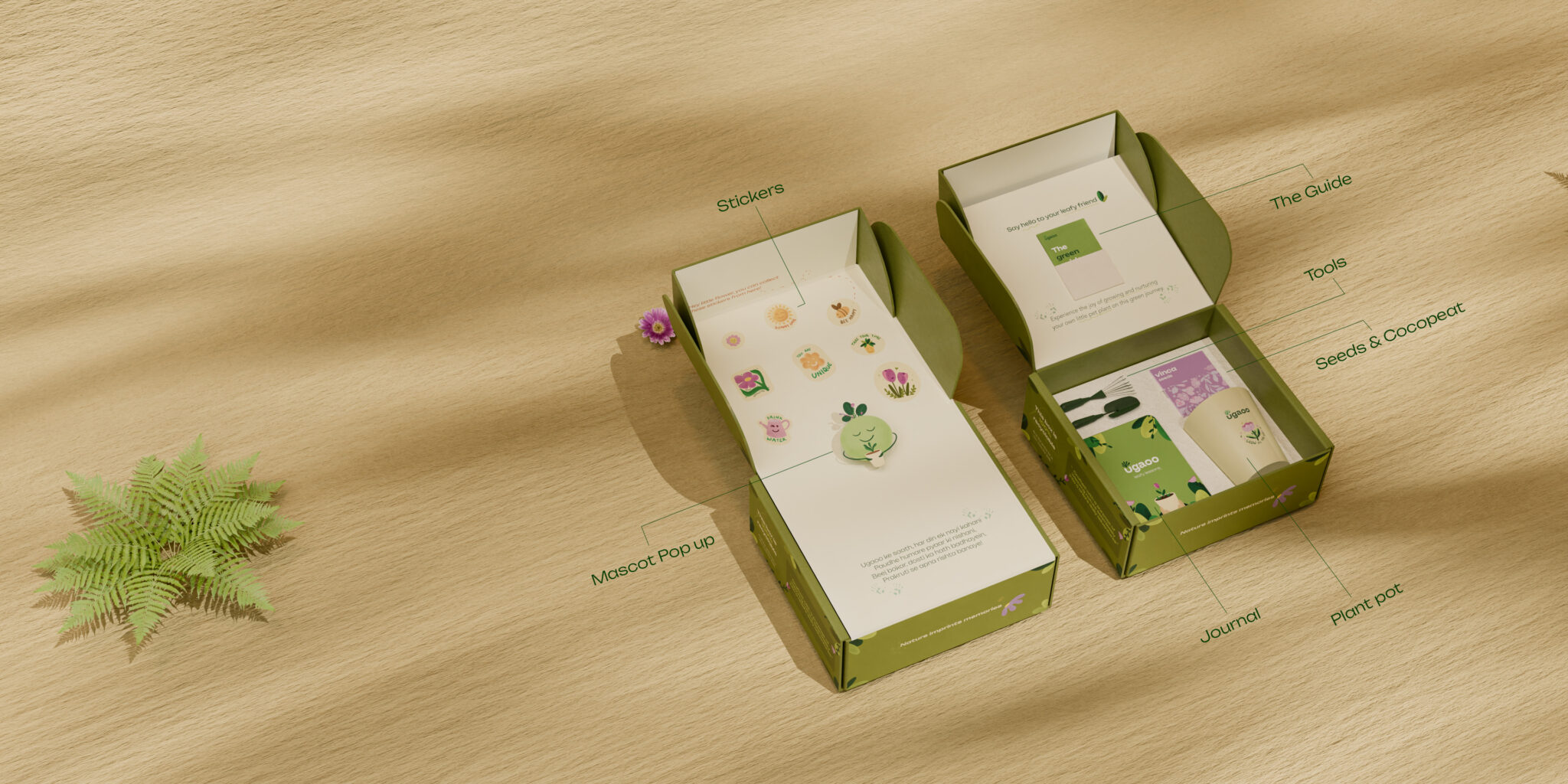 The design concept for this packaging is ‘Pet Plant’, embodying the essence of planting by seamlessly integrating the motive of “From screens to greens, cultivating young minds with the joy of gardening.” This integration is achieved through illustrations, elements, and textures that bring the concept to life. The design features a mascot, representing the child, surrounded by a lush green garden, symbolizing the growth and emergence of the child into the world of greens. The design captures the beauty of planting, evoking joy and a welcoming feeling through it’s color palette. The vibrant shades of yellows, greens, and pinks in the color palette add charm to the overall package, enhancing the experience. The design aims to communicate Ugaoo’s mission of bringing the joy of greenery to children, because every pet plant nurtured is a step towards cultivating a green future.