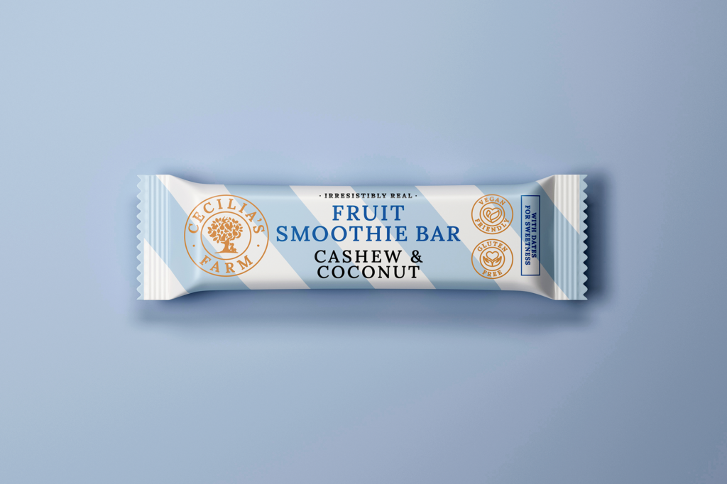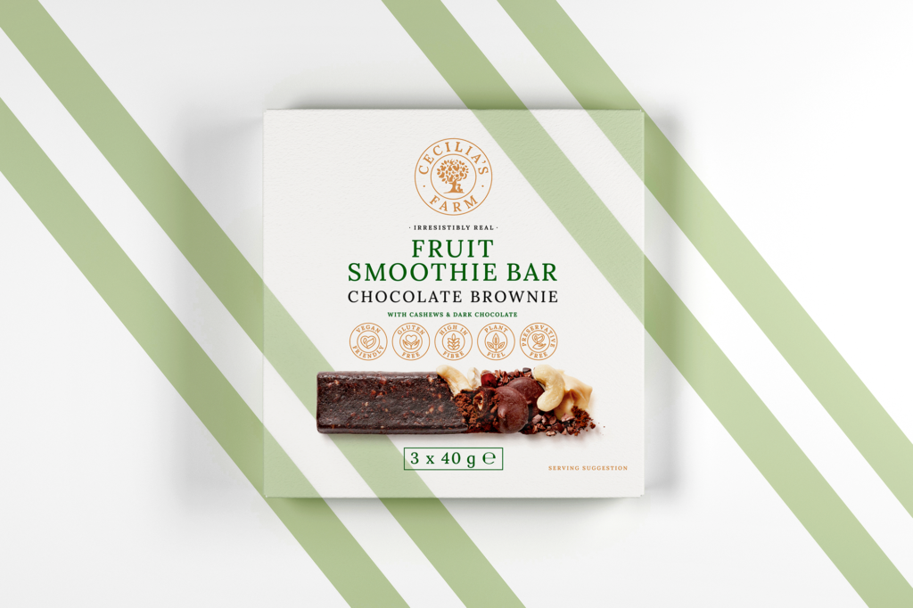 The Fruit Smoothie Bars have a contemporary feel through the matt high quality boxes, the trendy Nordic pastel shades, and the striking diagonal lines. As with all Cecilia’s Farm products, I utilised world-class food photography that doesn’t just show consumers what’s in each bar, but showcases the ingredients and product.