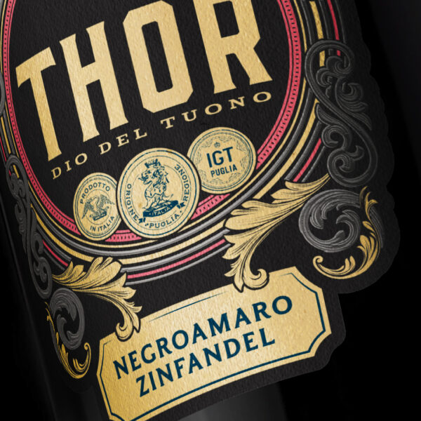 The name THOR is the focal point of the label’s structure; the decorative elements revolving around the name aim to focus attention on it, further aided by the size of the typography, synonymous with his strength and power.