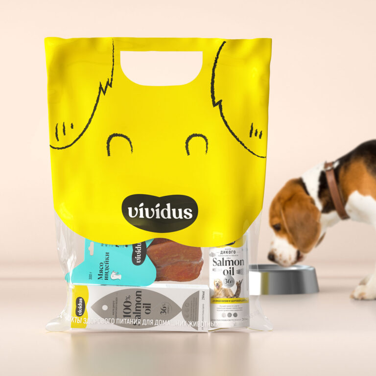 Vividus dog snacks are designed to support dental health. Studying competitors on store shelves, we realized that it would be difficult to stand out with color or packaging design. So, we decided to make an unusual sleeve-shaped packaging. The sleeve shape completes the idea of the nose in the logo, becoming a full-fledged dog’s snout. Friendliness and brightness are maintained through bright colors and friendly illustrations marking different products in the line.