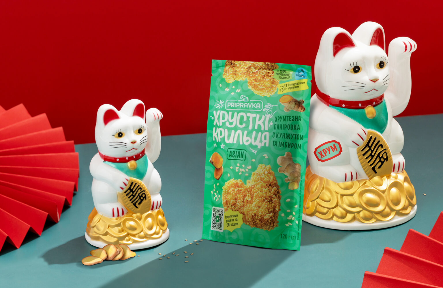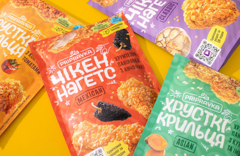 The “Crunchy breading” mixes from Pripravka is a ready-made breading mixture for cooking meat, fish, vegetables, and even cheese in a pan, in a saucepan, or deep-fried. What exactly to munch on with friends depends only on your mood, and Pripravka has already taken care of everything else. This product was supposed to be a novelty in the category and replace ordinary breadcrumbs. Therefore, the packaging had to be bright, emotional, with as large and appetizing food styles as possible. Our task was to convey the mood of the holiday and a surge of emotions, as well as clearly present the main elements of product communication with the consumer.