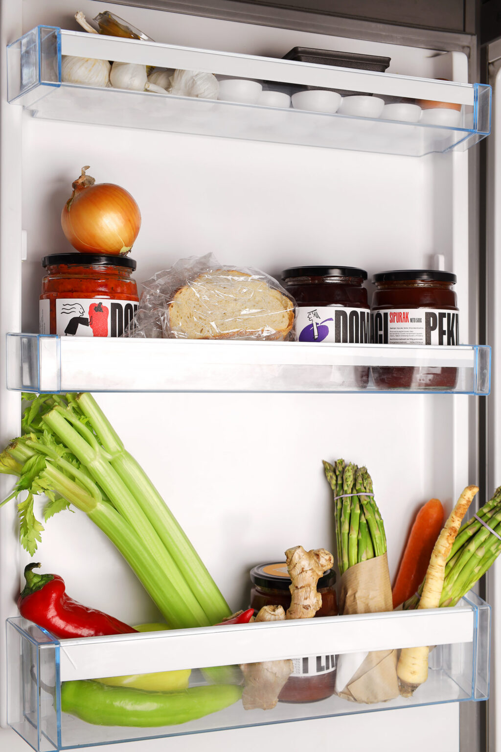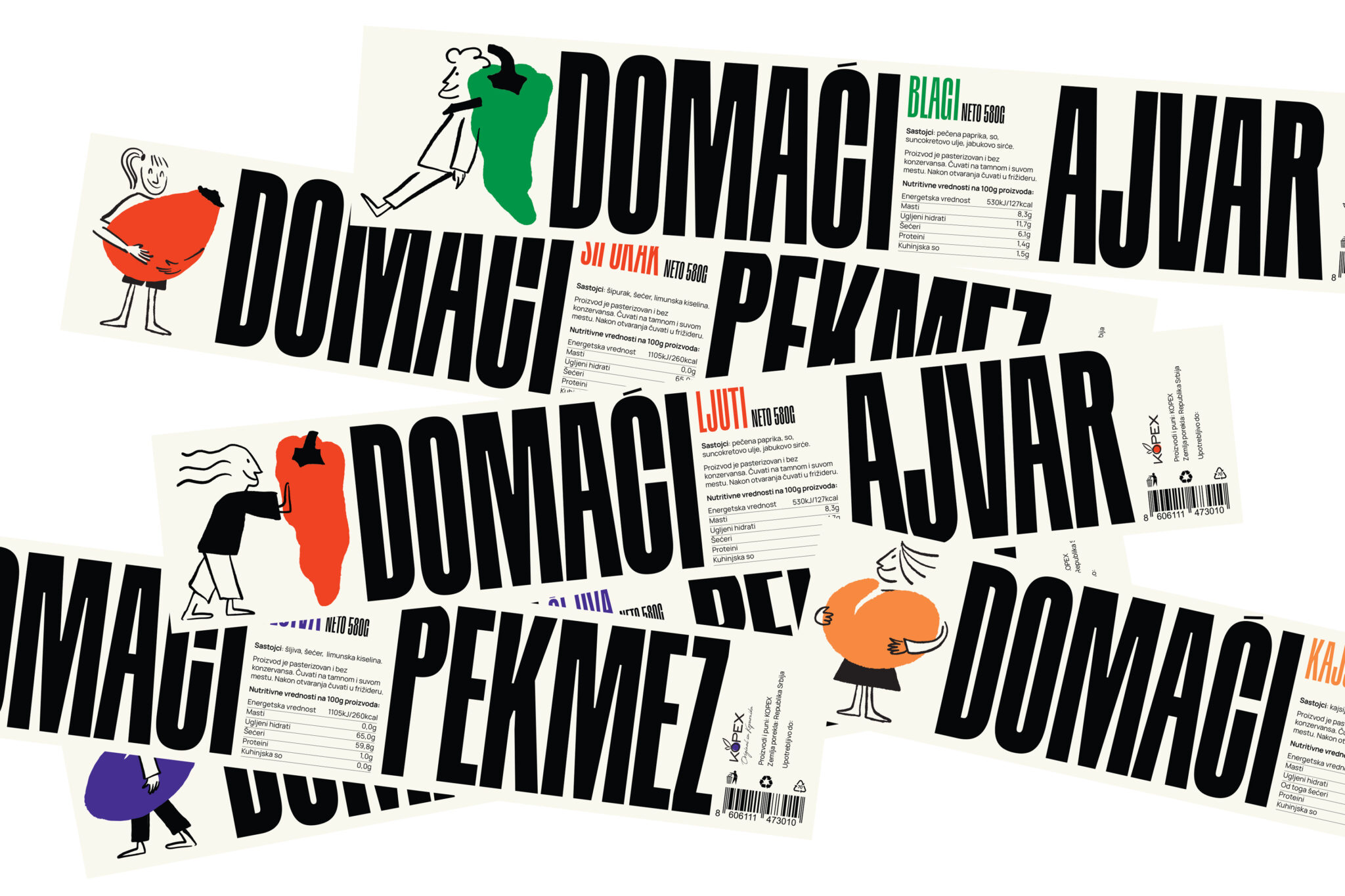 Our first clue was to change how the jar is perceived- from a commonplace object to a more conceptual item by applying an eye-catching label with a thick oversized typography prompting a rotational gesture. The main information is noticeable even from the last aisle- that Kopex ajvars and jams are exquisite domestic products. As a counterbalance to the heavy typography, we doodled a few light sketches in the style of newspaper comic strips, with lively characters interacting with fruits and vegetables. For the website, we additionally animated this cheerful troupe to perform acts such as juggling peppers to entertain the visitors. The overall idea was to diverge from the conventional representation of traditional food products and offer a more daring design, the one that makes these fine products stand out of the crowd.