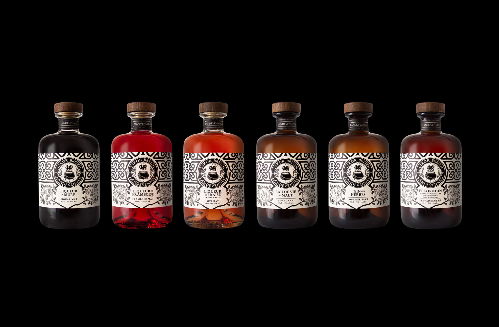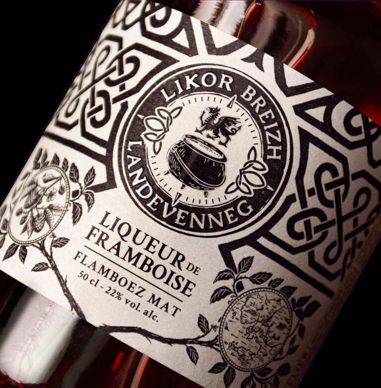 Landevenneg liquors were inspired from Breton Celtic mythology. Even before the Christian era, the region was a place of worship and spirituality for Celtic peoples. The patterns used on the labels evoke traditional Breton iconography. The logo plays a central place in the overall composition, with Celtic and Breton codes combined with the Landevenneg cauldron and the Red Lion.