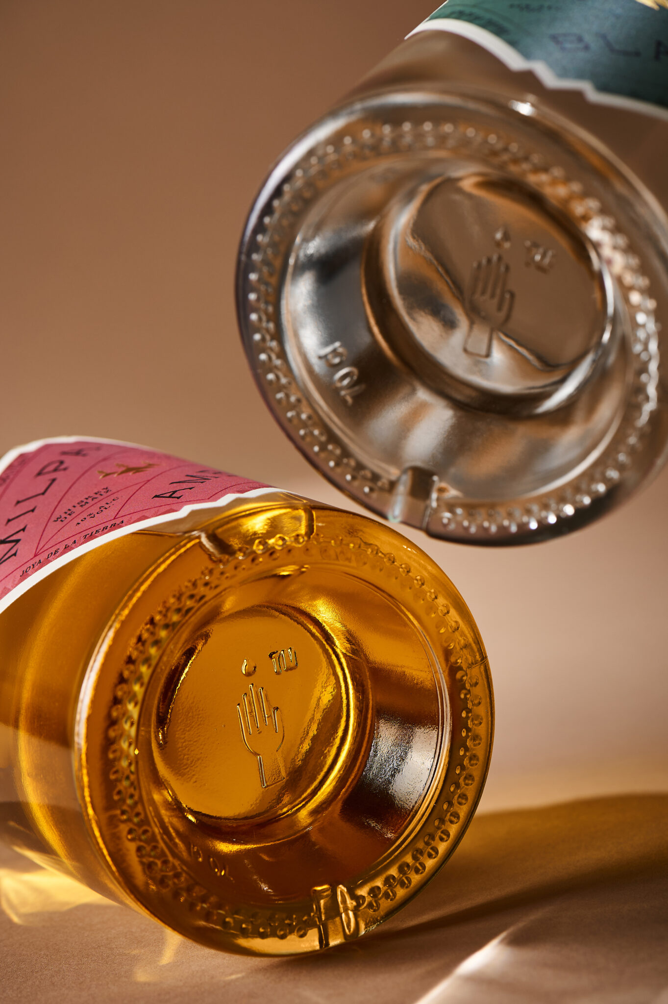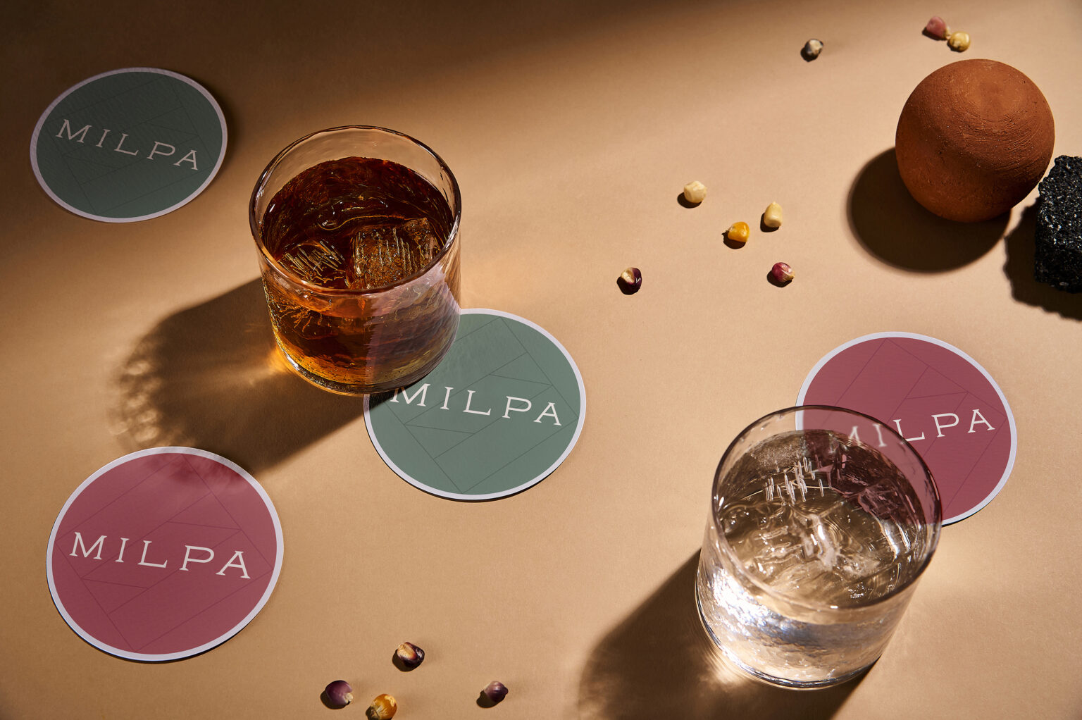 The wordmark that we designed for the brand evokes the vintage lettering of old Mexican cantinas (bar), stores and apothecaries, with a symbol representing the majestic mountains and the milpa as a cherished jewel of the earth. Likewise, the label’s geometrical shape in the bottle is inspired by the Mesoamerican abstract art, adopting a form that remind us of a gem.