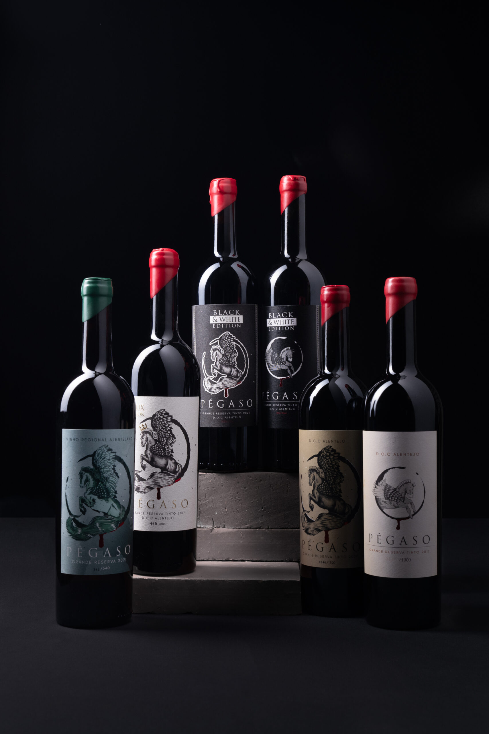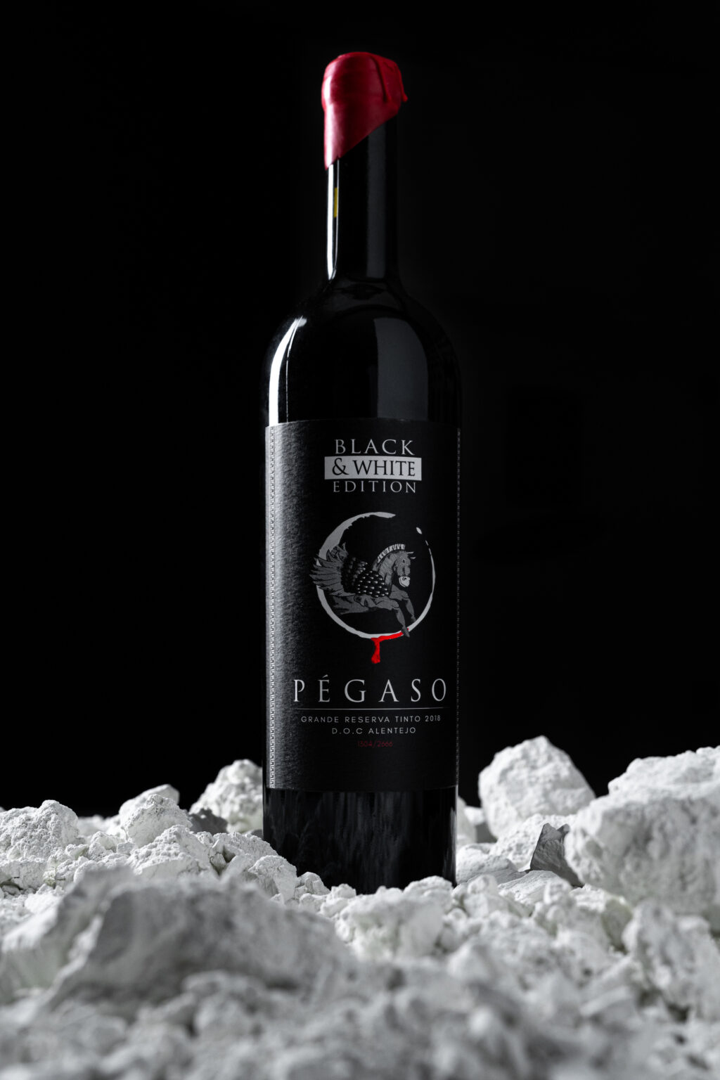 PÉGASO BLACK AND WHITE EDITION GRANDE RESERVA 2018. Um vinho completamente diferente da edição anterior (PÉGASO GRANDE RESERVA TINTO 2017), com a adição de 5% de vinho branco ao Alicante de 2018, que estagiava há meses em barricas. São assim 2666 garrafas numeradas, vedadas com rolha flor 45×24 da melhor qualidade, rotulada em papel texturado, e encaixotadas em caixas personalizadas.