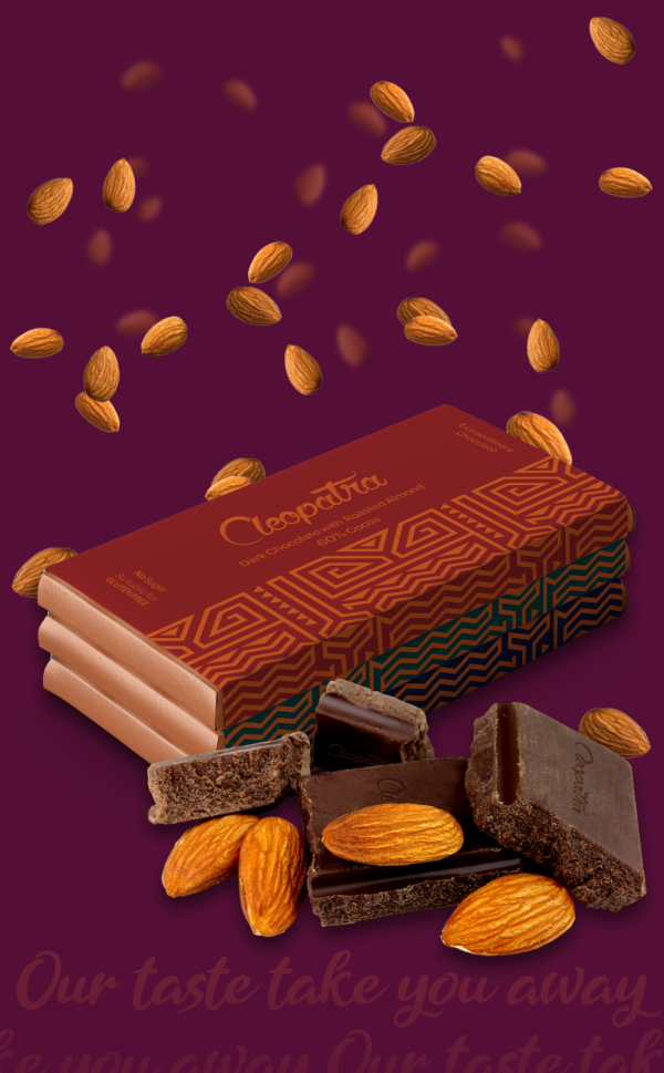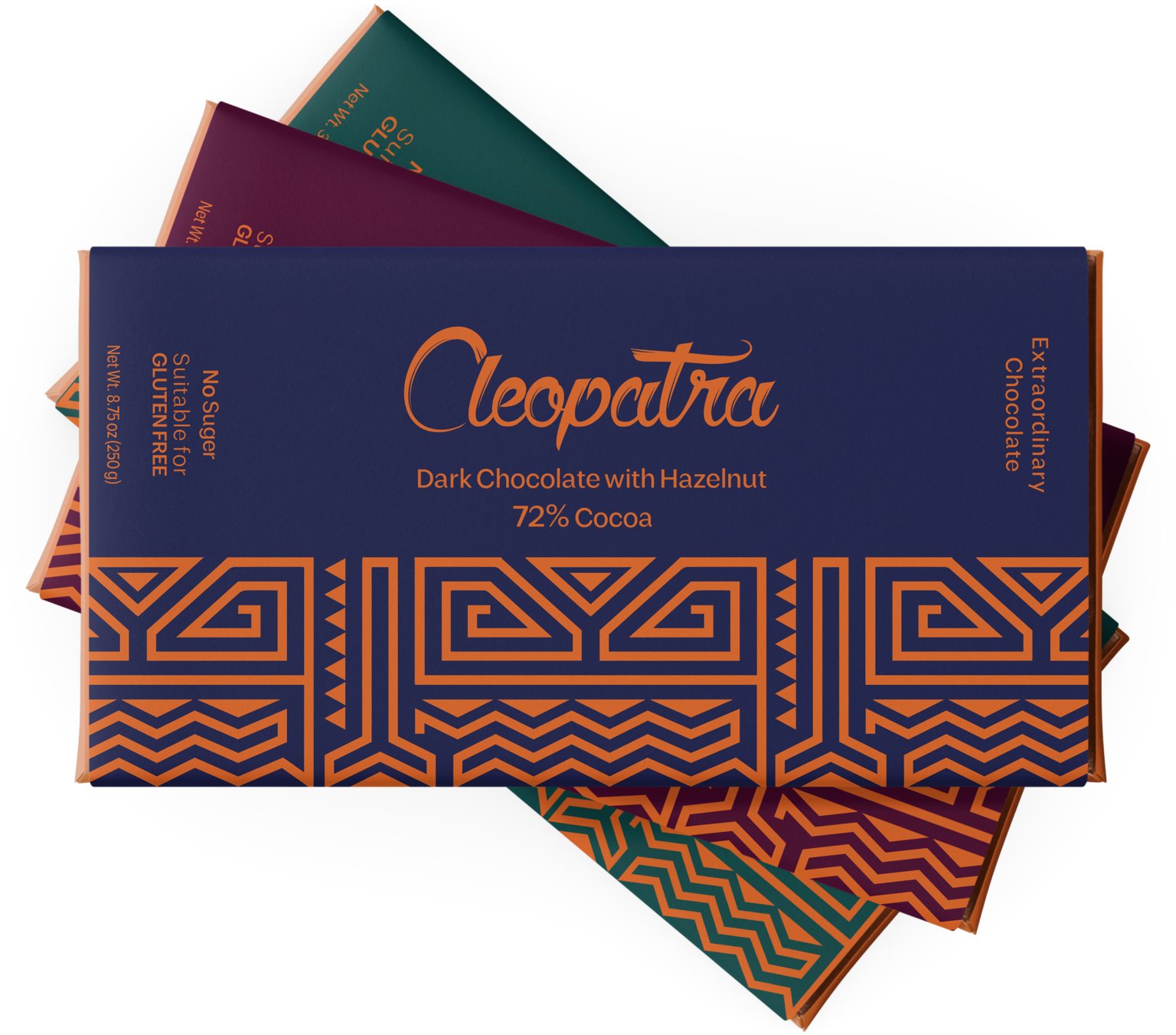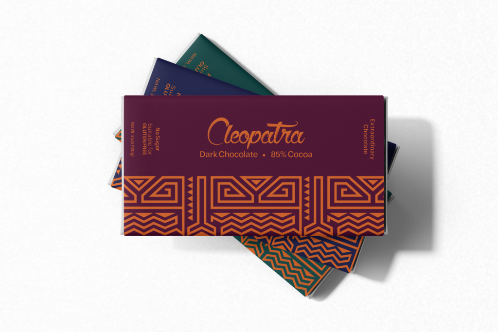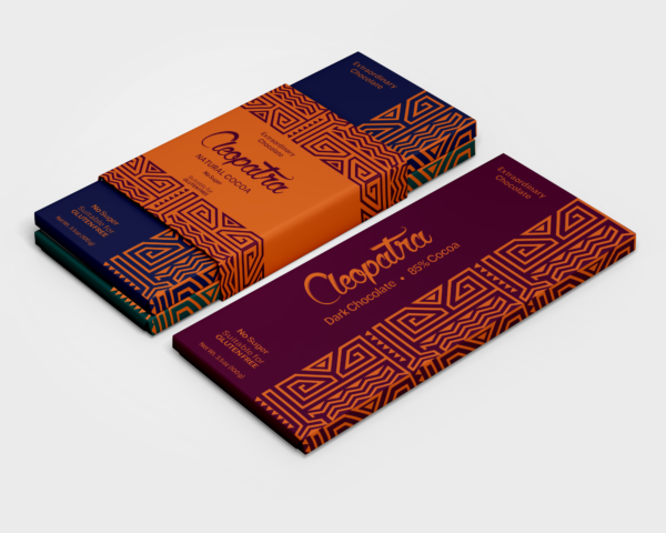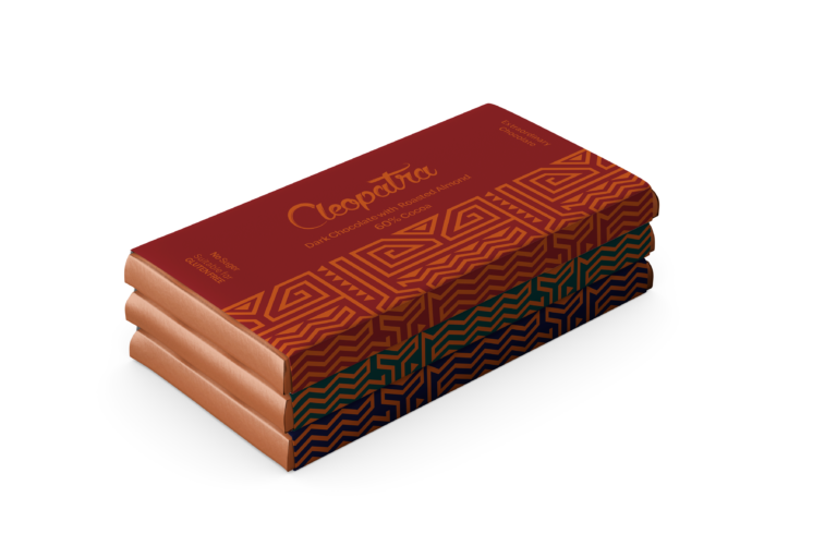 Intricate hieroglyphic motifs adorn the packaging, adding an air of mysticism and intrigue to the Cleaopatra Chocolate experience.