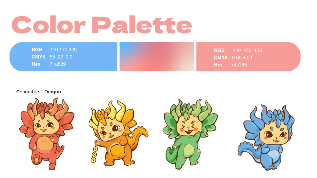 One more interesting thing is the representation of four dragons—Red, Yellow, Green, and Blue—each symbolizing a different season: Spring, Summer, Autumn, and Winter. Then, we utilized blue and pink colors combined with a gradient mesh grainy effect to create a seasonal movement from winter to spring.