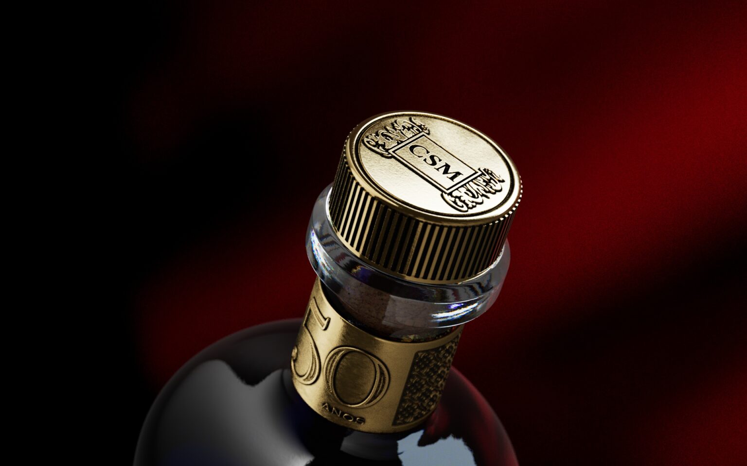 Fine paper, gold foil, alloy bartop developed from scratch, charming kneck bottle highly embossed, gold and black medallion to stand out above the paper label and a stripe over the bartop with gold foil details.