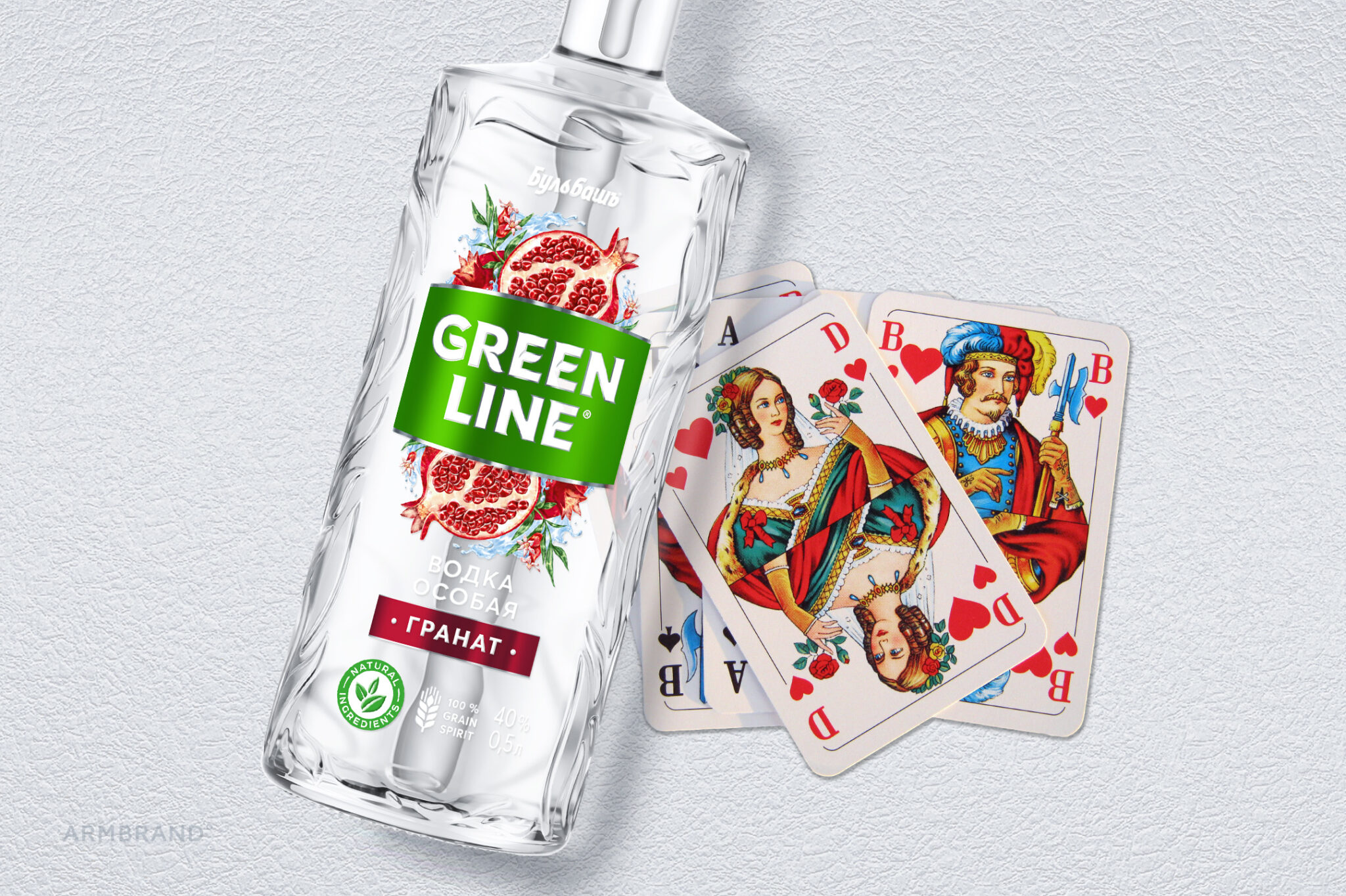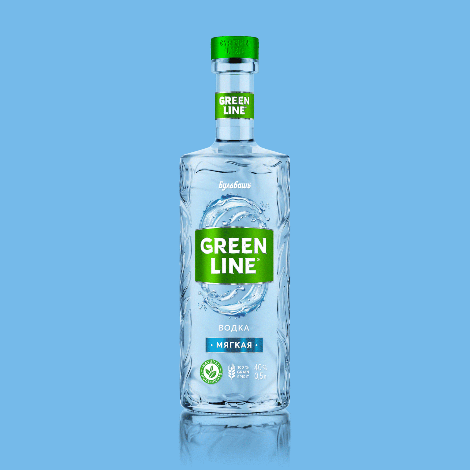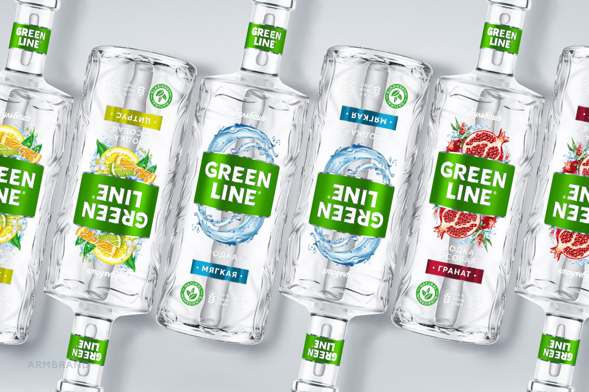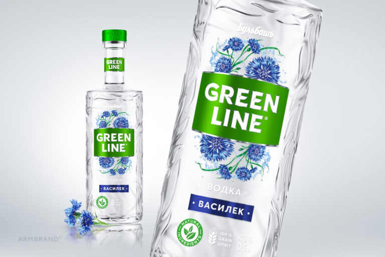We have developed the logo with unique lettering that fits the bottle and brand positioning. The added green plate forms a single block on the shelf, symbolizing the name GREENLINE.