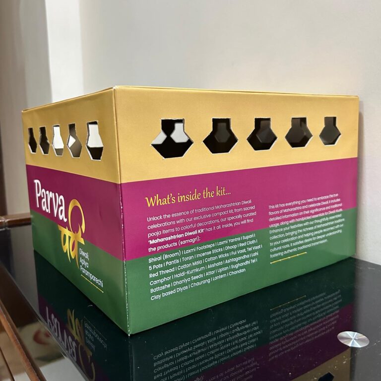 “PARVA, a brand name derived from the Sanskrit word meaning ‘occasion,’ is intricately linked with the rich rituals and celebrations of Maharashtrian Diwali. Rooted in tradition, PARVA reflects the vibrant essence of Maharashtra. The use of a Devanagari word underscores our dedication to authenticity, as this Diwali box draws inspiration from the unique elements of Maharashtrian culture. Crafted to celebrate Diwali in true Maharashtrian style, PARVA embodies the spirit and heritage of the region. Appropriately, ‘parva’ also holds significant meaning in Marathi, highlighting our deep connection to the local traditions.”