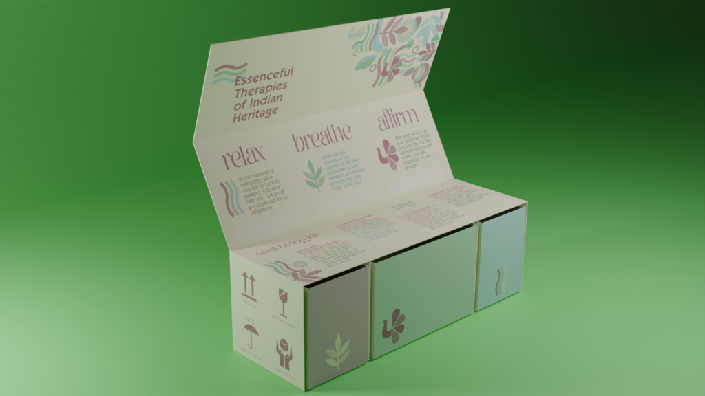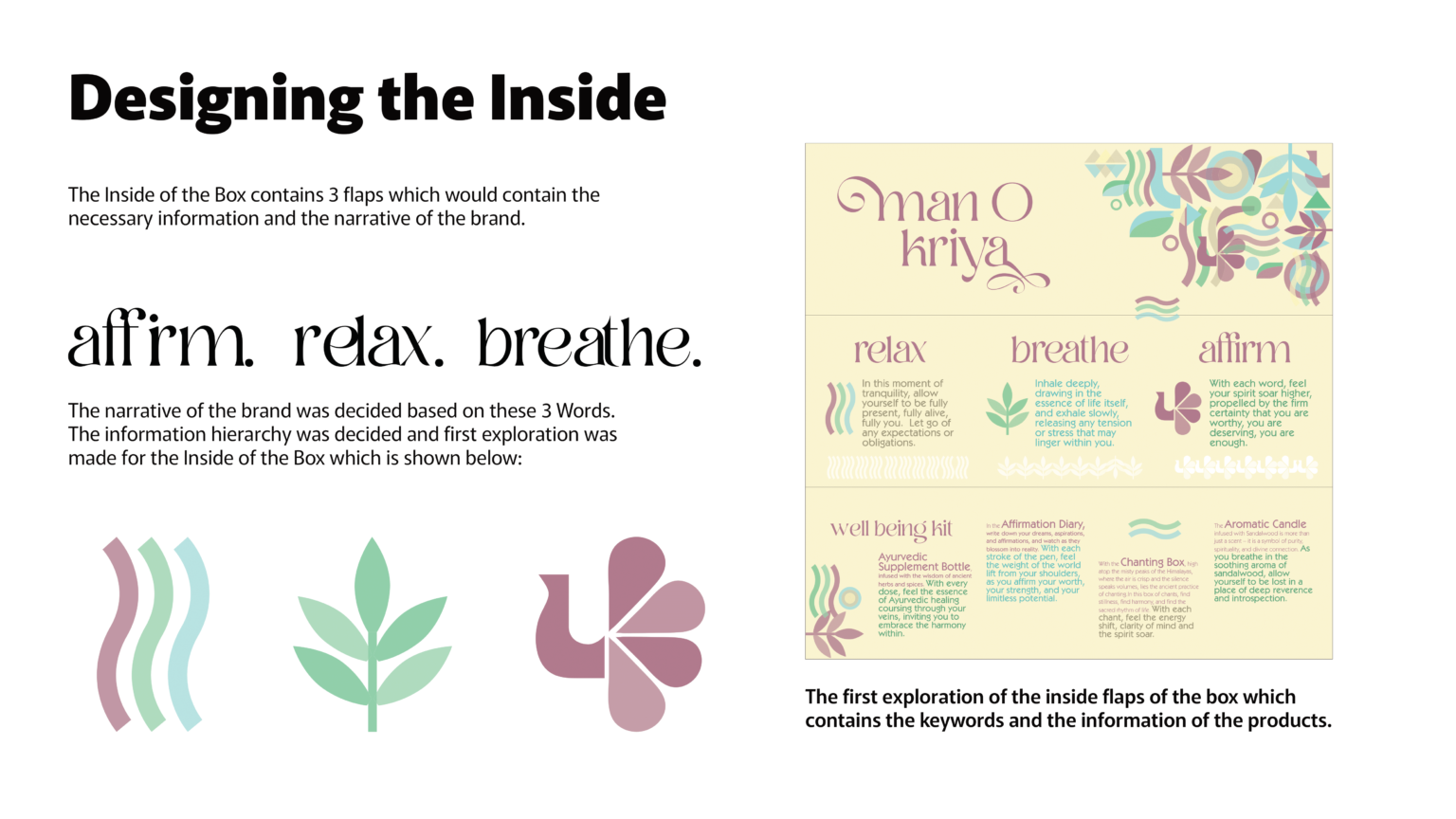 The Design incorporates three key words: “relax”, “breathe” and “affirm” which further associate with the tone of voice for the brand. Based on the keywords, visual elements based on Semiotic style were created like the waves, peacock, leaves etc.