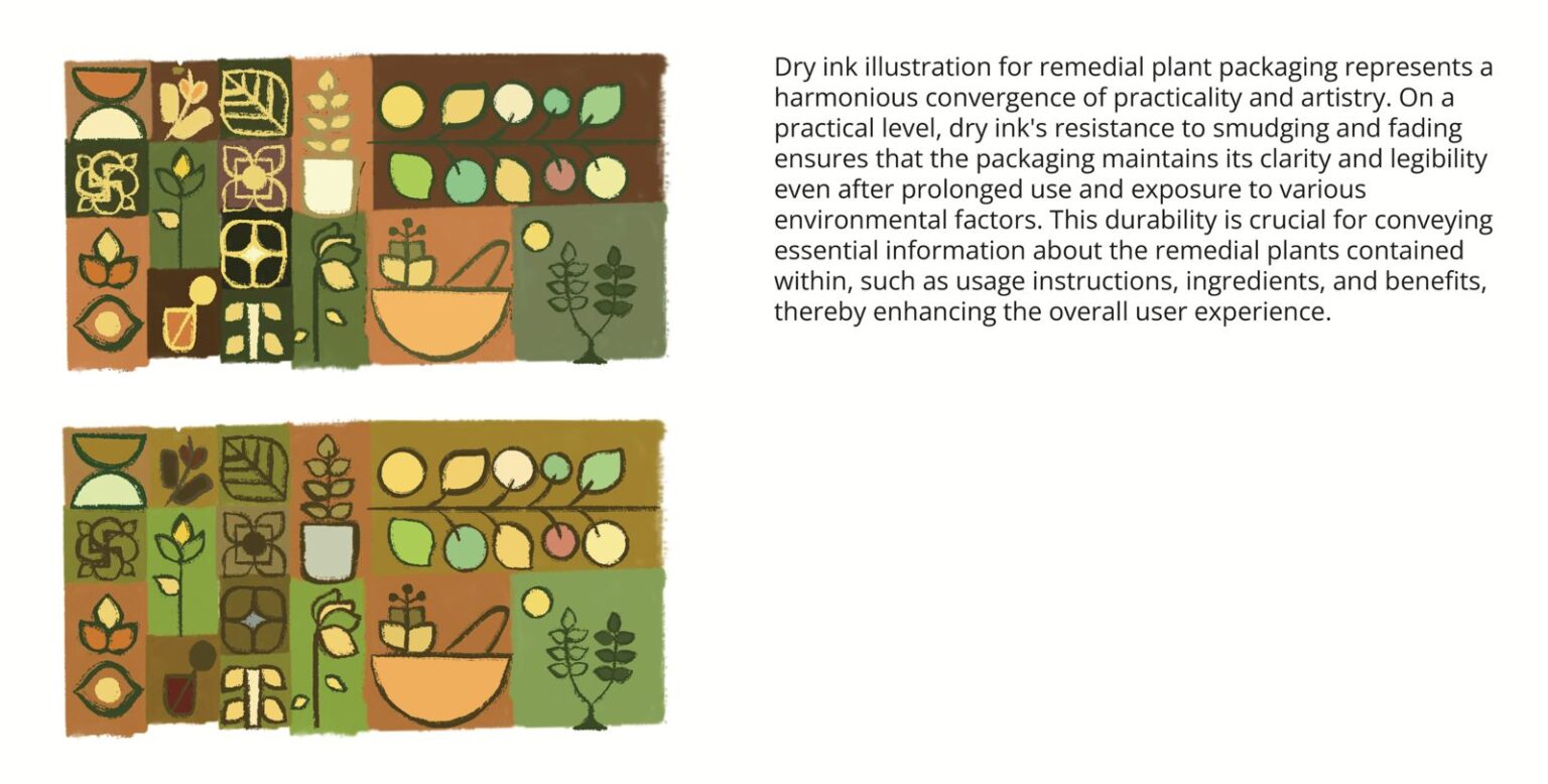 Dry ink illustration for remedial plant packaging represents a harmonious convergence of practicality and artistry. On a practical level, dry ink’s resistance to smudging and fading ensures that the packaging maintains its clarity and legibility even after prolonged use and exposure to various environmental factors. This durability is crucial for conveying essential information about the remedial plants contained within, such as usage instructions, ingredients, and benefits, thereby enhancing the overall user experience.