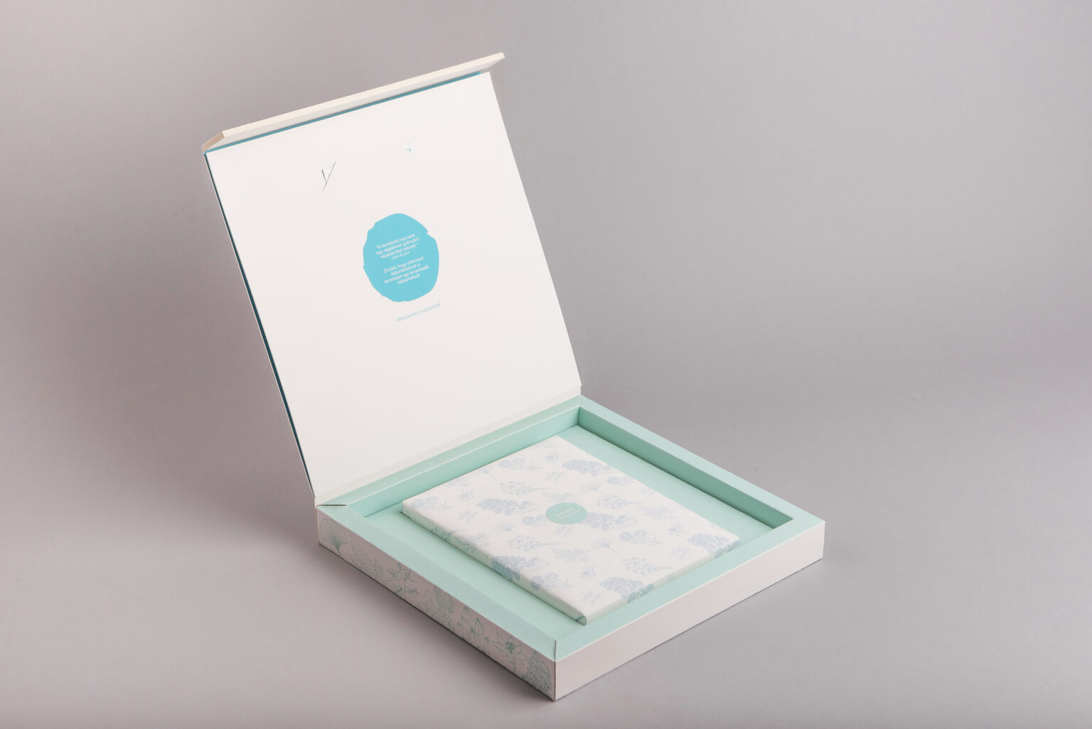 The double-walled box has an interior recess shaped to fit the plaster form, ensuring proper protection for the product. It has a magnetic closure. For wrapping the product, I designed tissue paper with a plant pattern. A business card can also be placed inside the box. Additionally, an accordion-fold booklet was created to accompany the box, reflecting the imprints made by the relief technique.