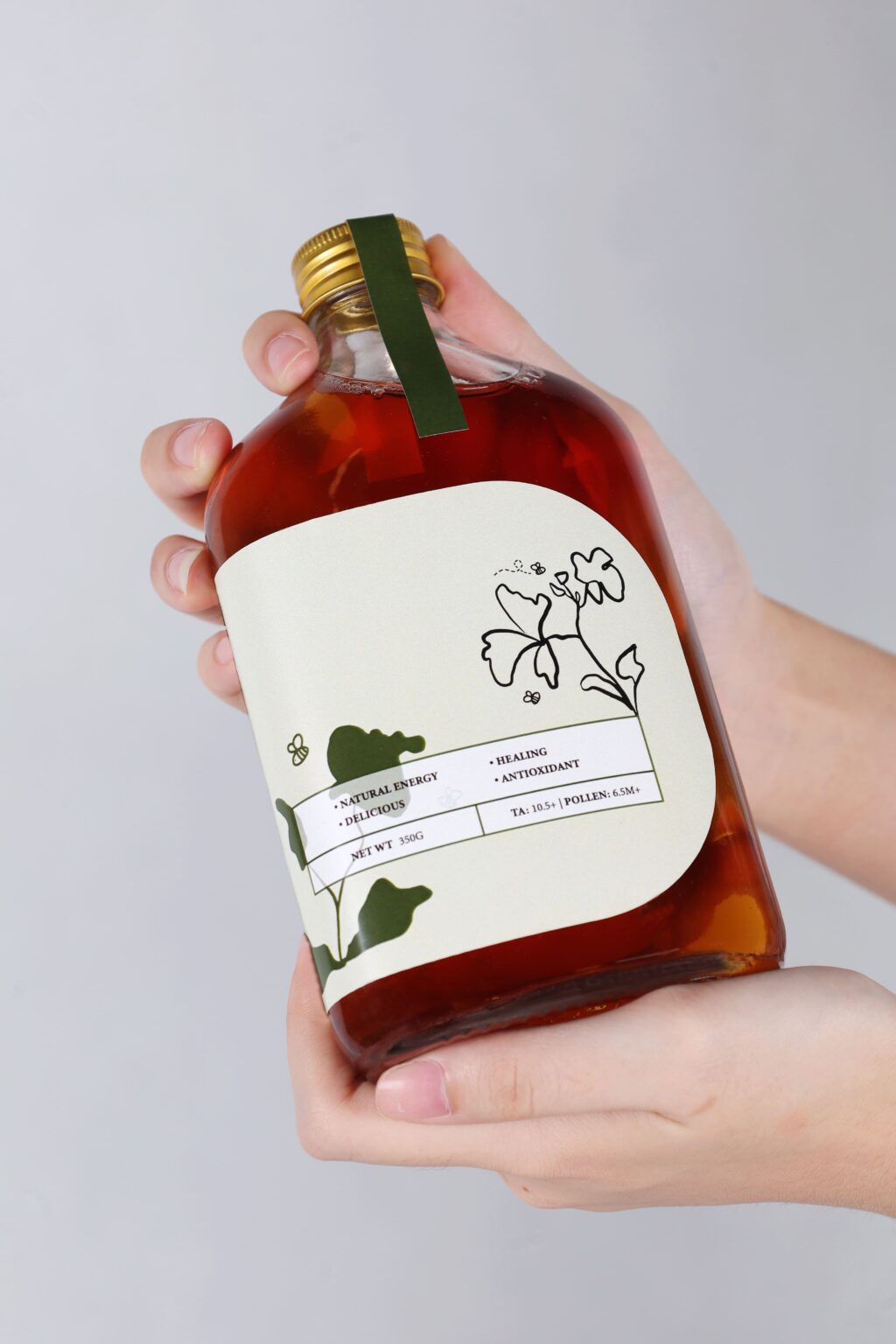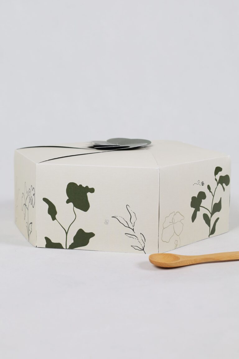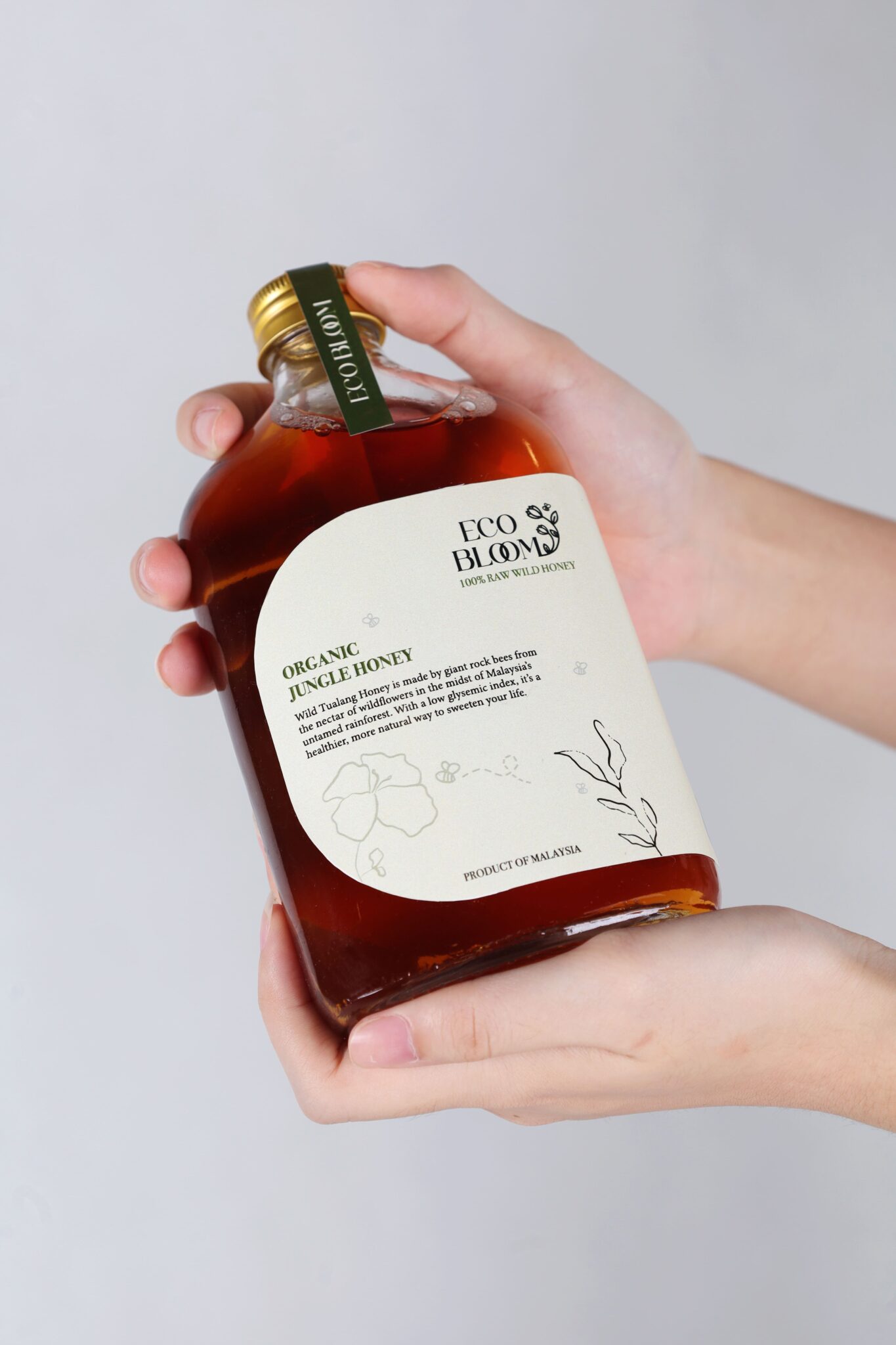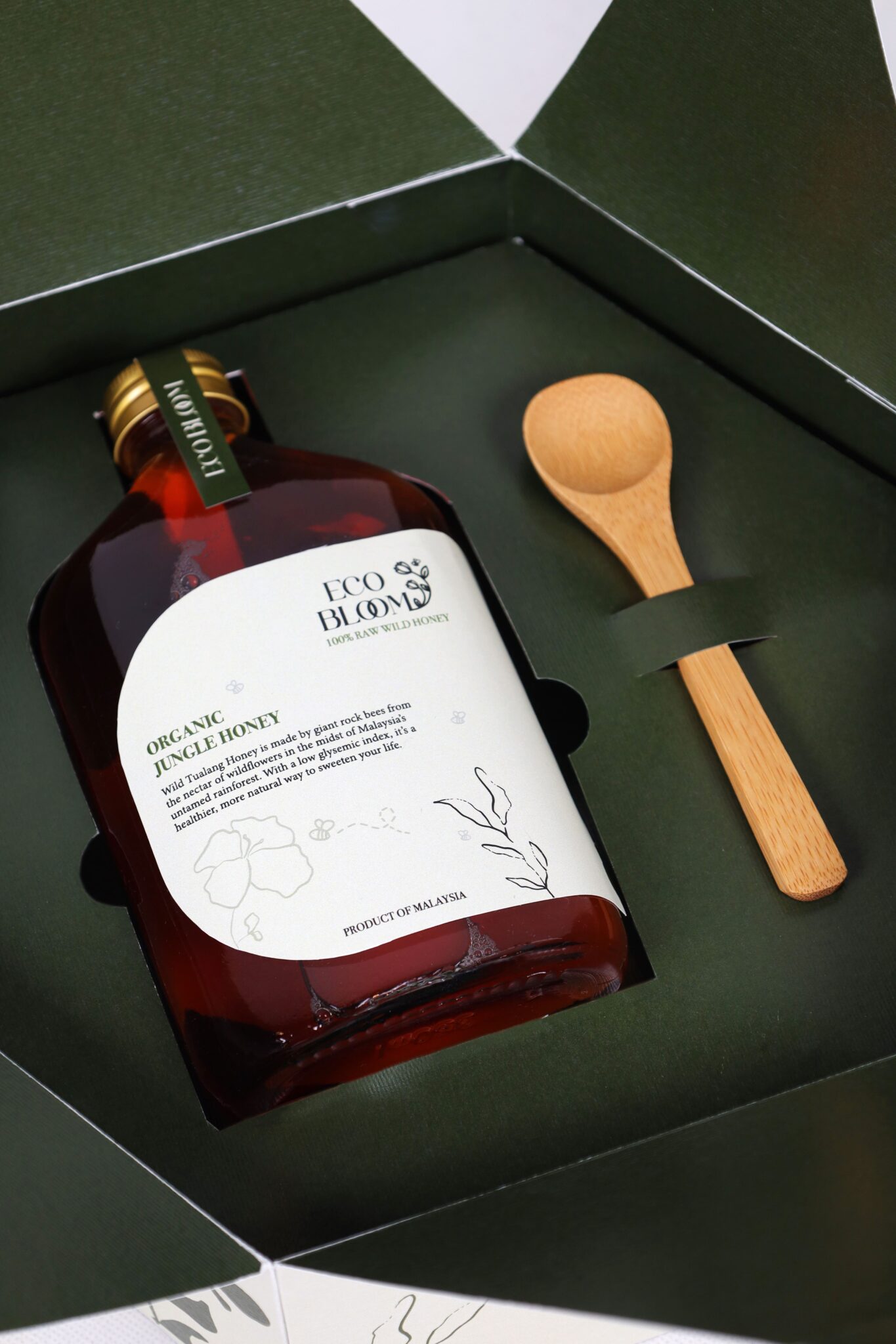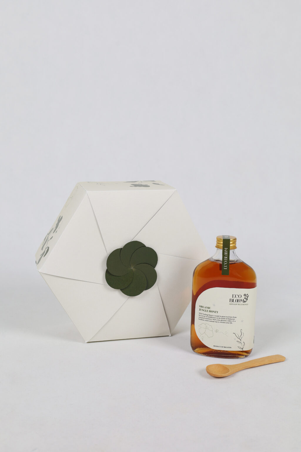 Tualang honey is a Malaysian multiflora jungle honey produced by the rock bee (Apis dorsata), which builds its hives on the branches of tall Tualang trees located mainly in the north-western region of Peninsular Malaysia. The brand name “EcoBloom” features overlapping ‘o’s, resembling both a bee’s wing and a flower. The colour palette I’ve used in my packaging leans toward natural shades and the outer packaging is designed to look like a flower.