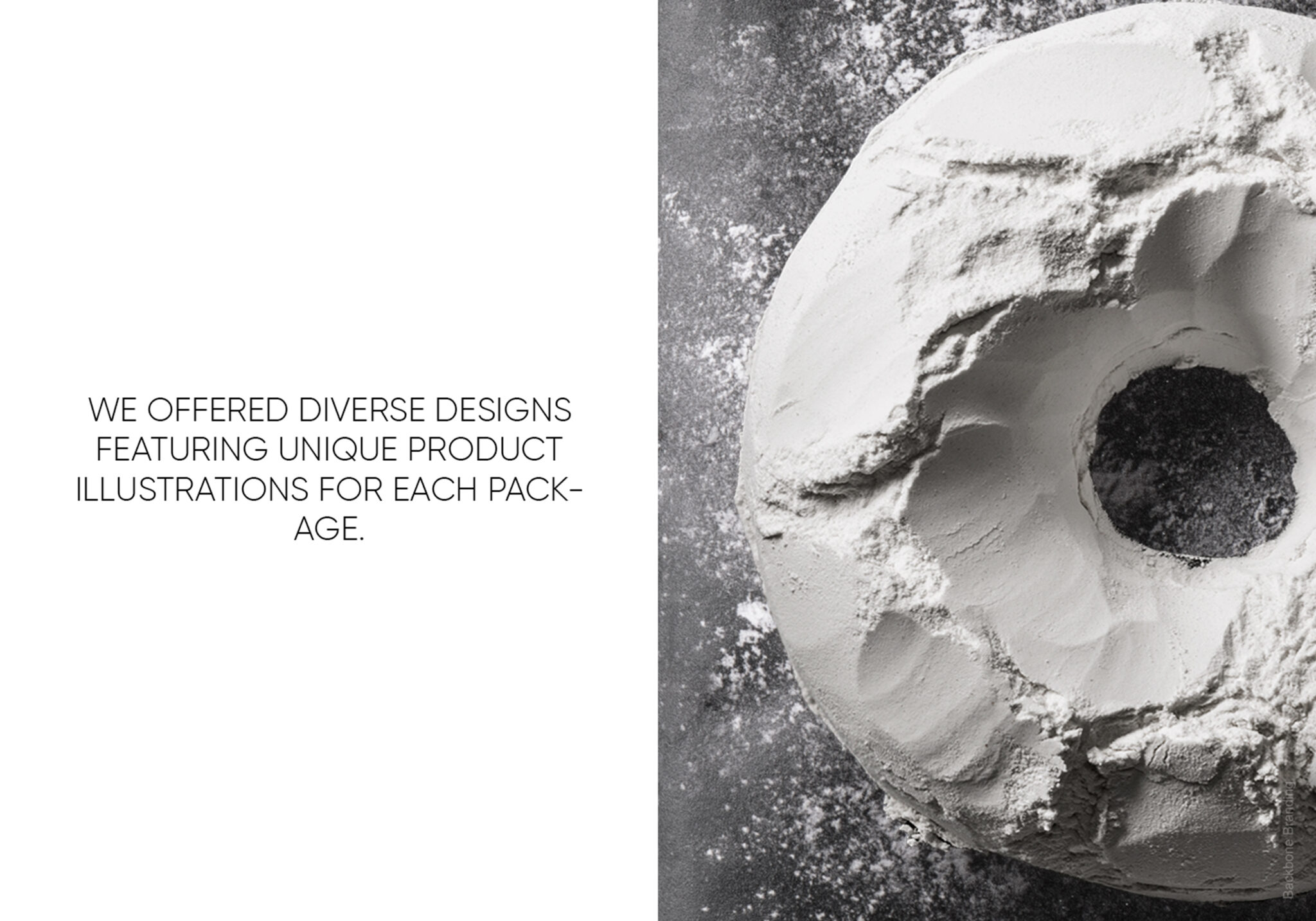 We created diverse designs with unique illustrations on each “Tak” flour package. The bold black packaging serves as a backdrop for the flour’s artistic display, showcasing sculptural shapes of popular bakery items like bread and croissants. These designs highlight the product and give a nod to its craftsmanship. The “Tak” logo stands out prominently, helping to maintain brand recognition, while the brand’s signature pattern on the sides reinforces its identity. This combination of art and branding makes “Tak” flour visually appealing and easily recognizable on the shelf.