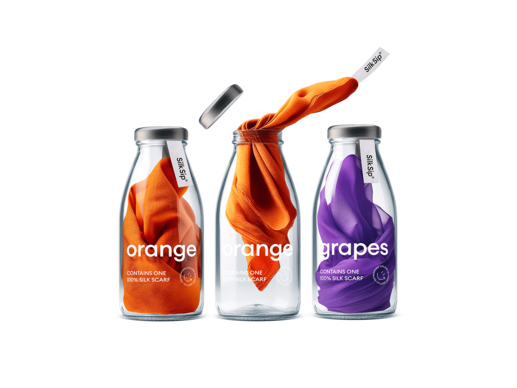 The idea behind “Silk Sip” is to create a refreshing and engaging way to package and present silk scarves. By utilizing glass bottles typically associated with fresh, fruity beverages, the packaging immediately captures attention and piques curiosity. This playful yet sophisticated design turns the simple act of purchasing a scarf into a delightful experience.