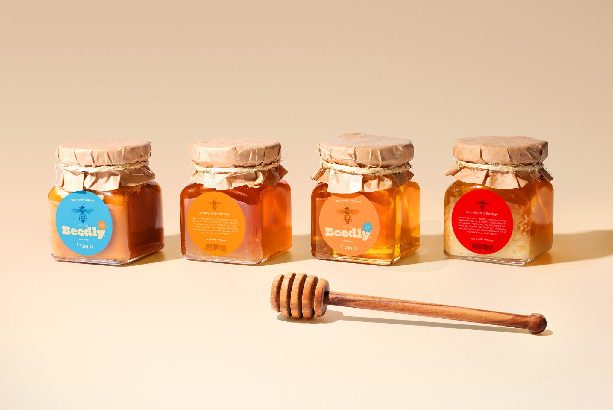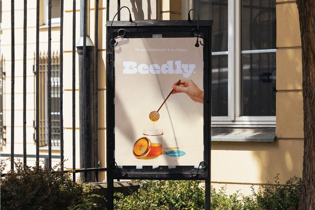 The branding and label design for Beedly, an American honey craft brand, emphasizes authenticity, nature, and craftsmanship. The design blends warm, vibrant tones seamlessly with honey gold and amber, reflecting the product’s organic origins. Playful typography is paired with imagery of bees, hives, and nature-inspired elements, reinforcing its artisanal quality. The use of textured paper adds a tactile, natural experience, giving the label a premium yet approachable aesthetic that highlights the purity and craftsmanship behind Beedly’s honey products.