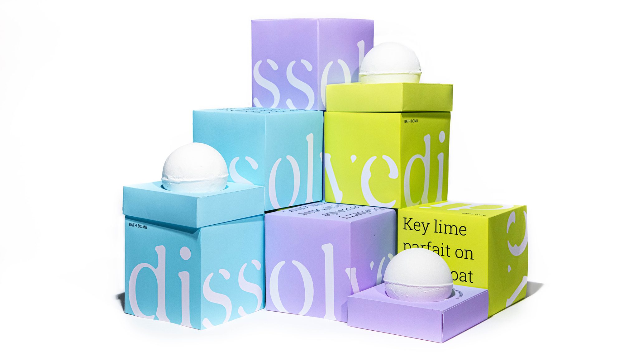 Dissolve is a bath bomb packaging concept that pairs bold typography with dessert-inspired scents. The design uses soft colors and a dissolving logo to reflect the bath bomb’s transformation in water, creating a direct connection between the packaging and product experience. The clean, minimalist design also brings out the indulgence of each fragrance.
