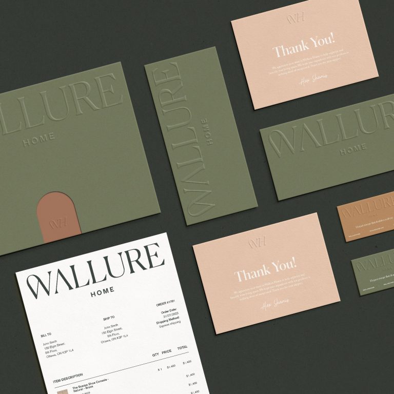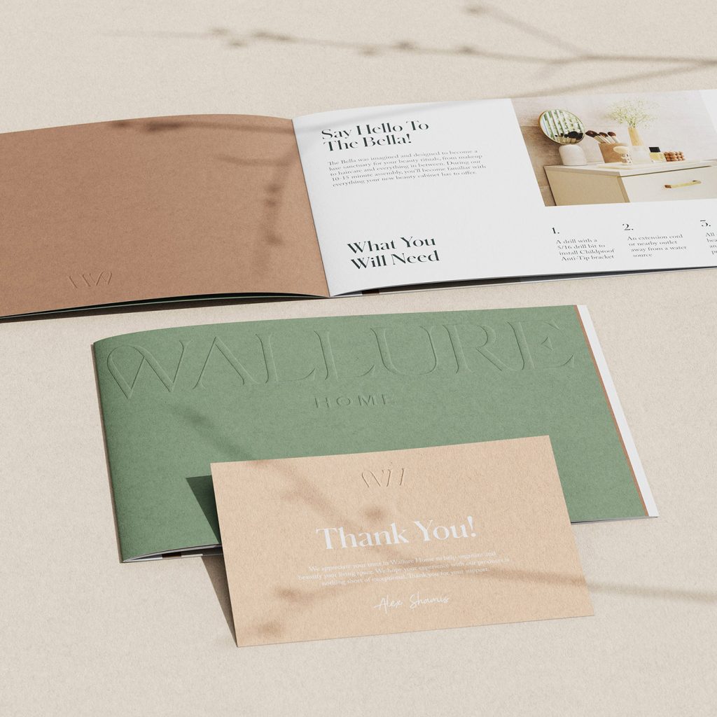 The brand name, Wallure, is a play on the word “allure,” signifying beauty, while the “Wall” in Wallure alludes to the brand’s focus on wall-mounted furniture. Our challenge was to develop a visual identity and print design that encapsulates the brand’s core values of creativity, functionality, quality, luxury, and sustainability.