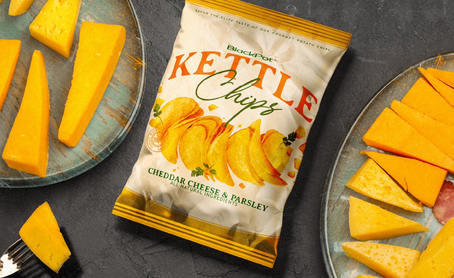 This project showcases the packaging design concept for “BlackPot: Kettle Chips,” a premium potato chips brand. The objective was to craft a visually striking yet sophisticated design that stands out on the shelves while conveying the brand’s artisanal quality. The packaging design features three distinct flavors: Sea Salt & Herbs, Hot Chilli Pepper, and Cheddar Cheese & Parsley. Each flavor is represented by a unique color palette and elegant illustrations that evoke the natural ingredients and bold taste profiles of the chips. The typography is designed to be impactful, with a bold, modern font that catches the eye, yet maintains an air of elegance and refinement. The combination of sharp lines and intricate details in the illustrations complements the typography, creating a cohesive and aesthetically pleasing design. Overall, this packaging concept reflects the brand’s commitment to quality and style, appealing to consumers who appreciate both taste and visual appeal.