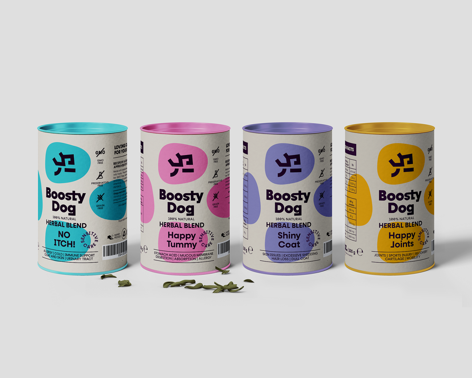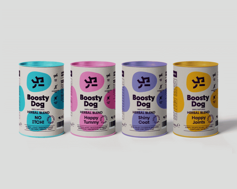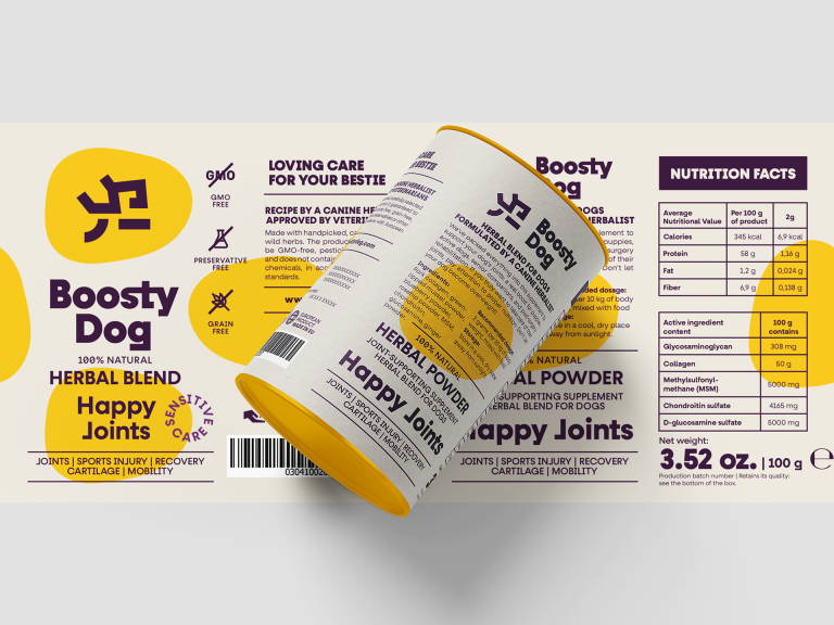 Boosty Dog is a 100% natural herbal blend for dogs, formulated by a canine herbalist. These specialized medicinal products are designed to improve the health, well-being, and quality of life of dogs, making them healthier and happier. I was commissioned to design the branding, packaging, and the visual communication standards for this wonderful family of herbal blends.