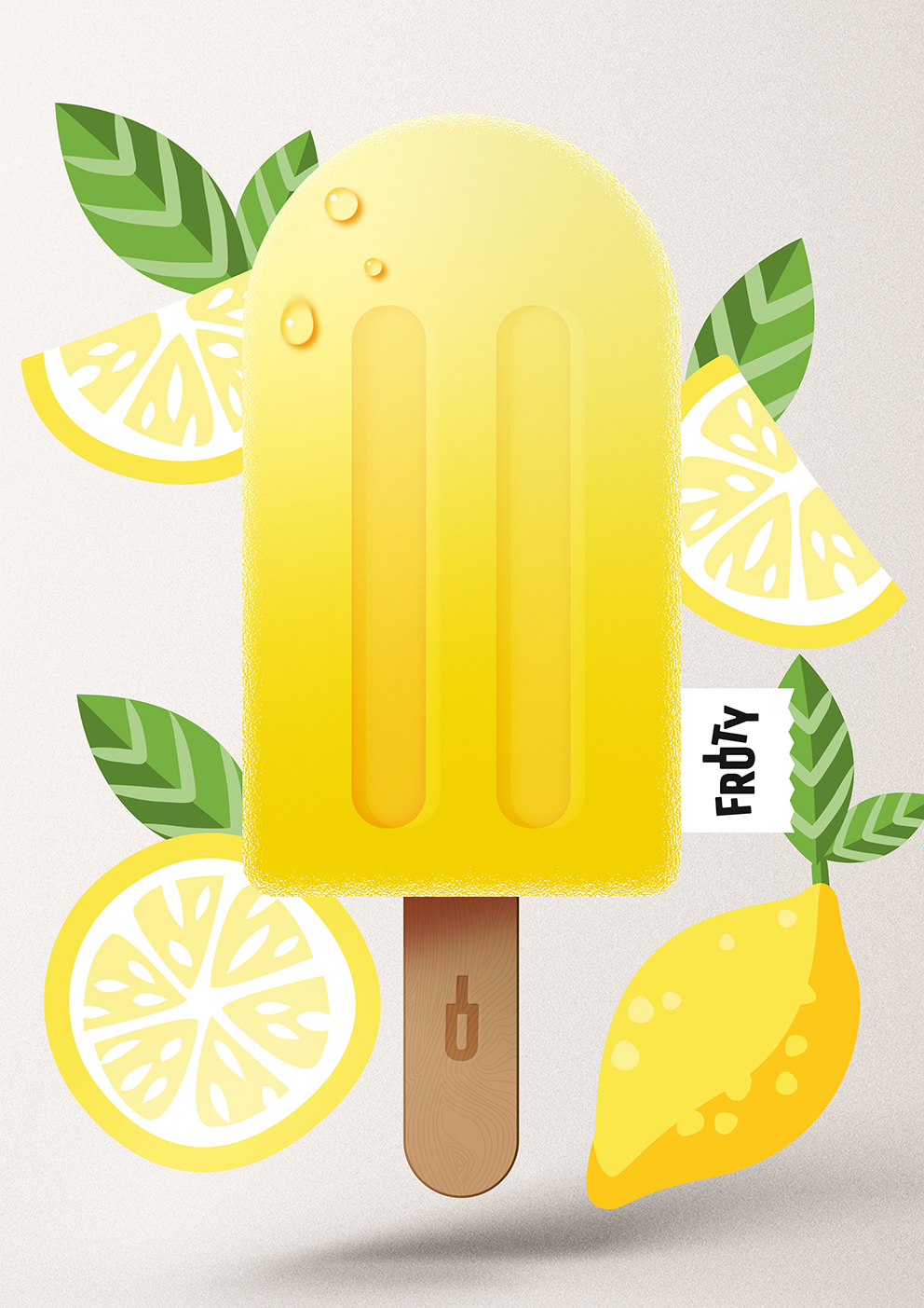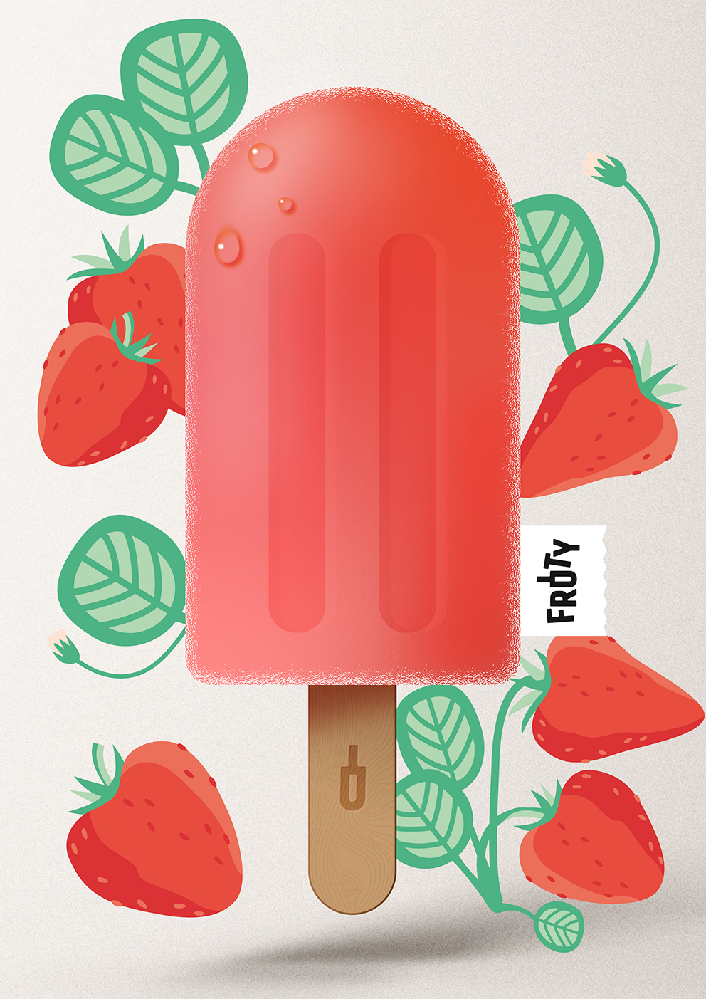 Conceptual packaging design FRUTY water ice in three fruity flavors: