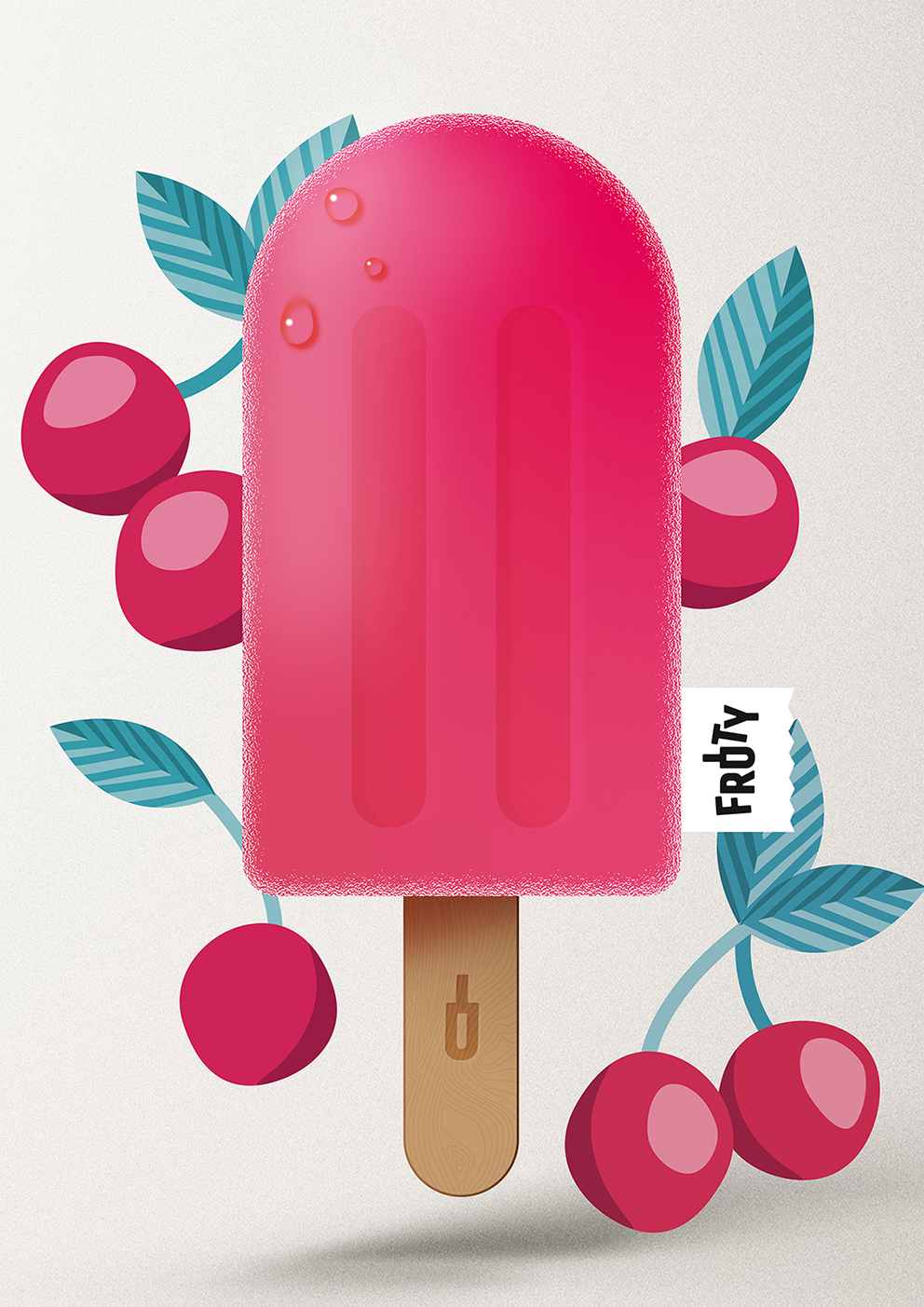 The design therefore shows the product itself in the form of a photorealistic image of ice cream in a generous and striking way. In the background, the fruits illustrated in flat style provide the flavor reference in lively abundance, playing around the ice cream star. The result is an eye-catching look that is reduced to the essentials and creates a lively and striking desire for a healthy and very fruity refreshment.
