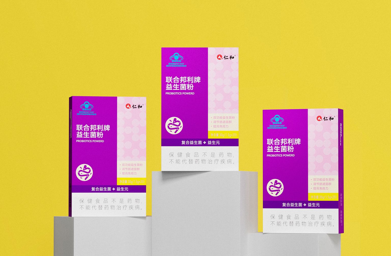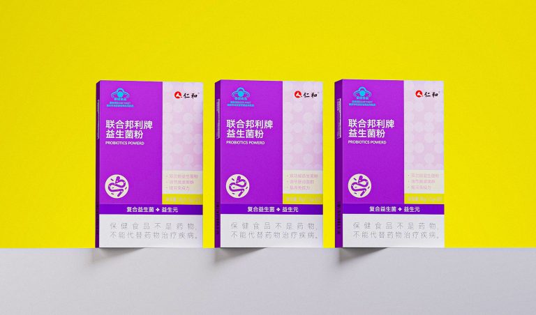 The packaging design for this probiotic powder focuses on a clean and straightforward visual approach. The primary green color represents health and vitality, creating an immediate connection to wellness. The yellow dotted area adds a playful touch while maintaining a sense of balance. The bilingual typography, in both Chinese and English, ensures accessibility for a wider audience. The icons and symbols effectively communicate the product’s benefits without overwhelming the viewer, enhancing user understanding. Branding elements are positioned prominently, conveying trustworthiness and aligning with a professional healthcare aesthetic. The use of contrasting colors and a clear layout helps differentiate key information, enhancing readability and creating a visually appealing, functional design.