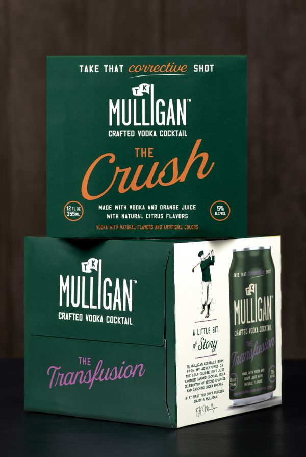 The 4-pack box design needed to support the key tenets of the brand and take advantage of the 360-degree branding opportunity. The wordmark was featured prominently on on every panel of the box along with the cocktail names while a photo of the can further aided in SKU recognition. The illustration of a golfer personifies TK Mulligan alongside the brand narrative, encouraging the viewer to celebrate the plot twists in life that become the best part of the story.