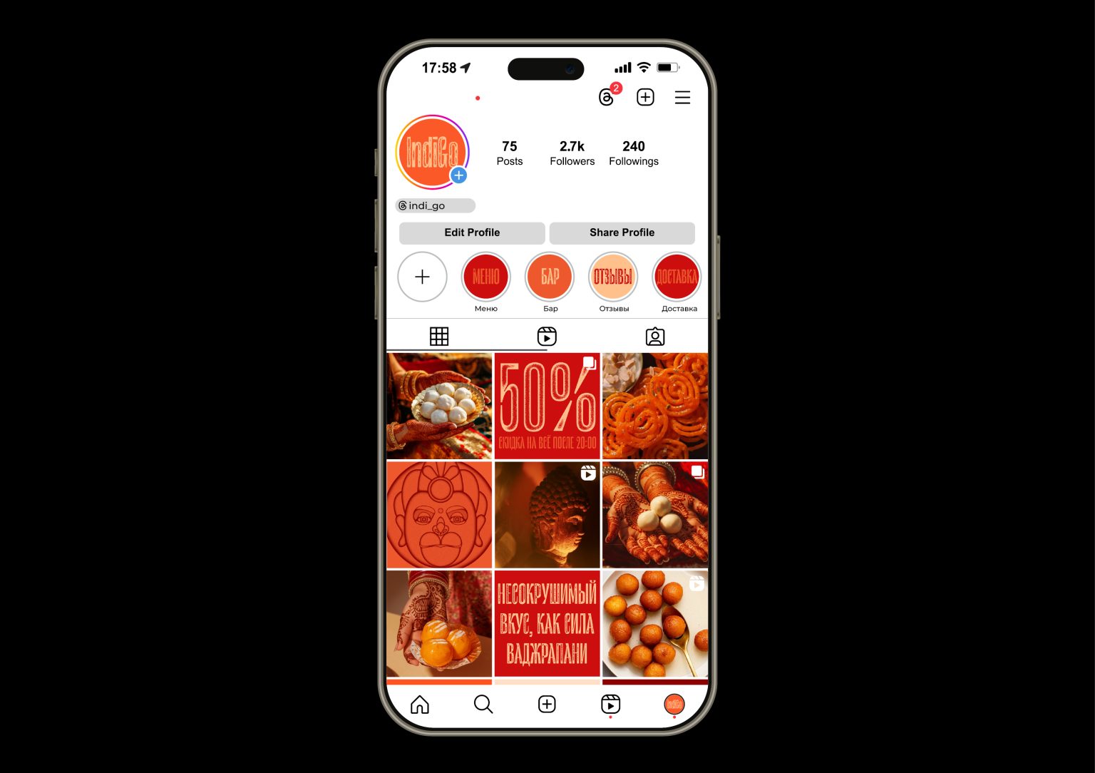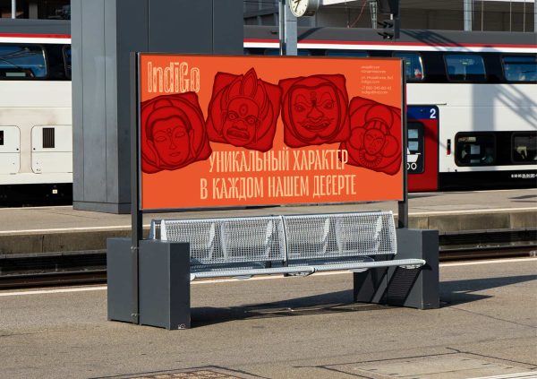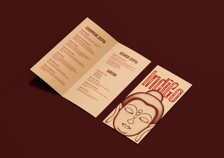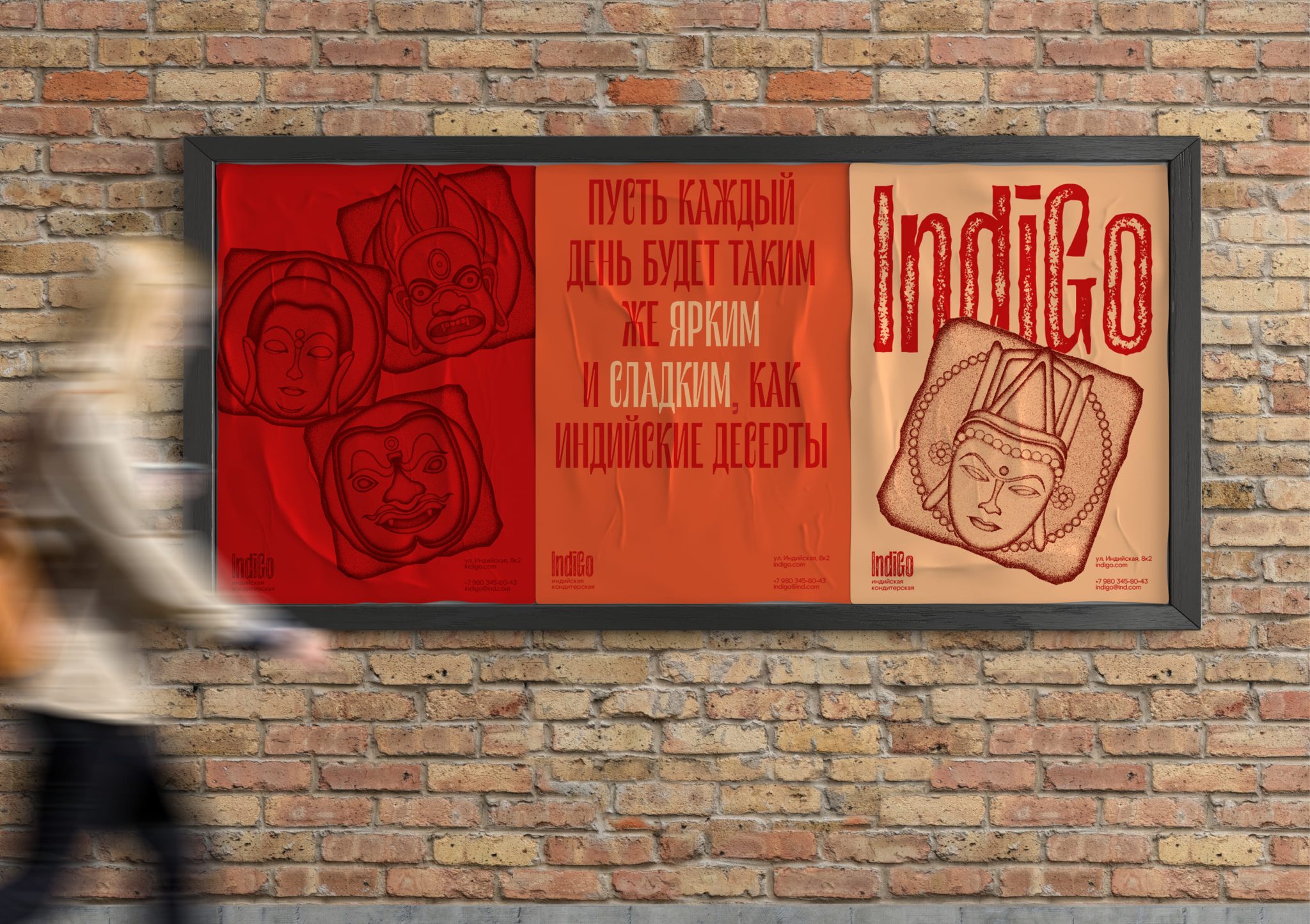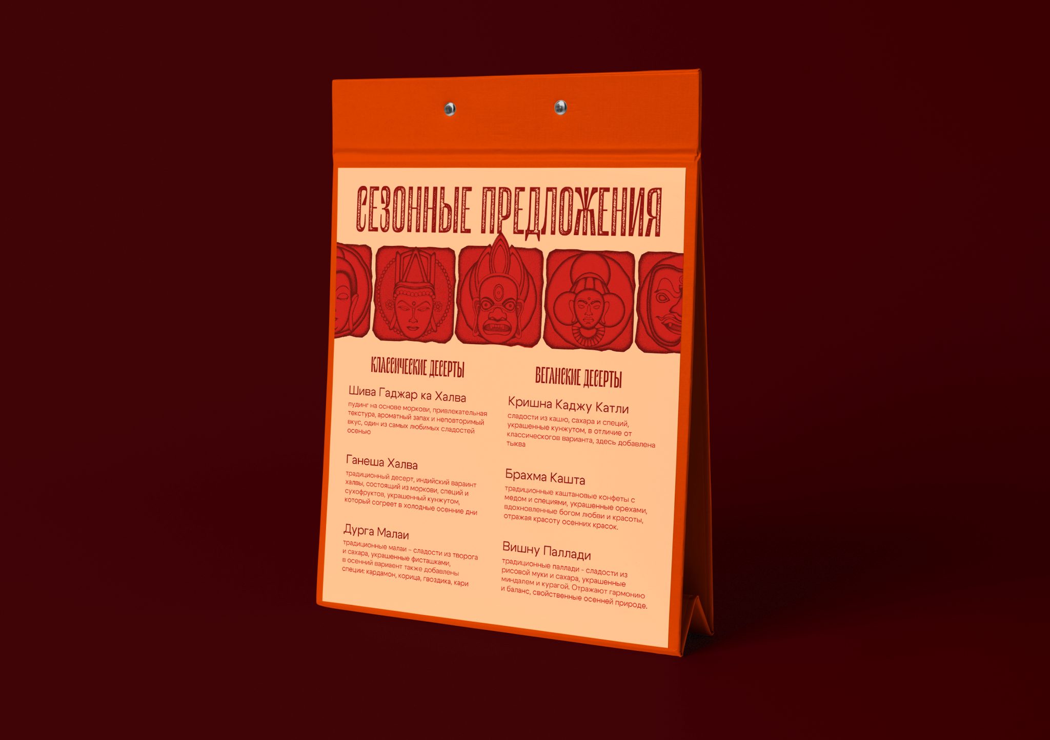 The brand identity’s metaphor is the stone sculptures and reliefs decorating the temples of India. The texture of the stone used in the design evokes associations with majestic Buddhist temples, and also imitates the texture of shortcrust pastry, from which many Indian desserts are prepared. The main colors of the corporate style – bright red, warm orange and soft beige – reflect the hot and sunny atmosphere of India, giving the style liveliness and warmth. The typography echoes the techniques used in the character design. The letters, like the images of the characters, acquire a crumbly, rocky texture.