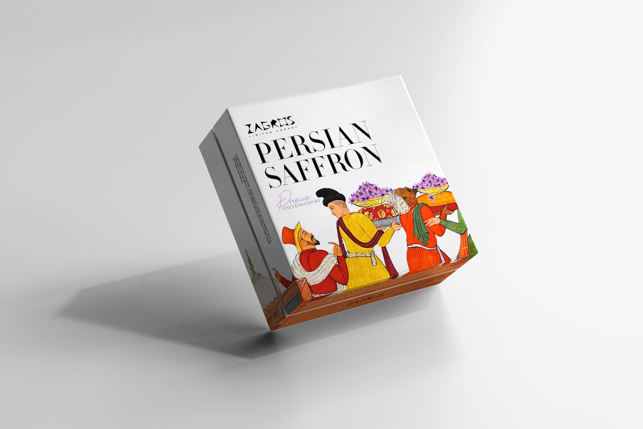 For Zagros brand saffron, the design directly references this idea by incorporating traditional Persian miniature art in a completely white and minimalist space. To enhance the connection between the customer and the product, modern and embossed fonts are used, creating a tactile experience that draws people in upon touch.