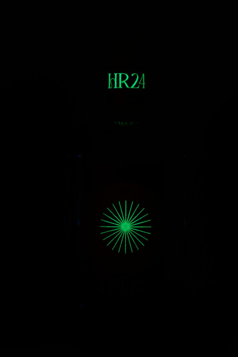 The concept stems from the presence of Syrah grapes, inspiring the pink hue, and Artemisia Absinthium, a key ingredient in absinthe. To evoke the green of absinthe, a fluorescent Ink was added, revealing itself in the dark. Absinthe was traditionally enjoyed during the famous “green hour,” which inspired the name L’Heure Rose and the 24-hour sundial depicted on the label, symbolizing the perfect moment to savor this gin.