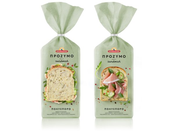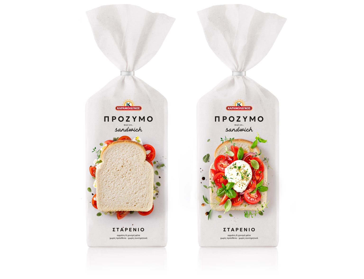 The design for Karamolegos’ sandwich bread packaging seamlessly combines natural aesthetics with modern minimalism. Using muted tones, the packaging reflects simplicity and wholesomeness, aligning perfectly with the product’s natural and nutritious essence. A central photograph of a bread slice creatively showcases the actual product, adding authenticity and trustworthiness. Surrounding the bread window are fresh, vibrant ingredients like lettuce, cheese, and sliced apples, offering a visual suggestion for delicious sandwich creations while emphasizing freshness. The clean typography and balanced layout further enhance the brand’s premium and approachable identity.