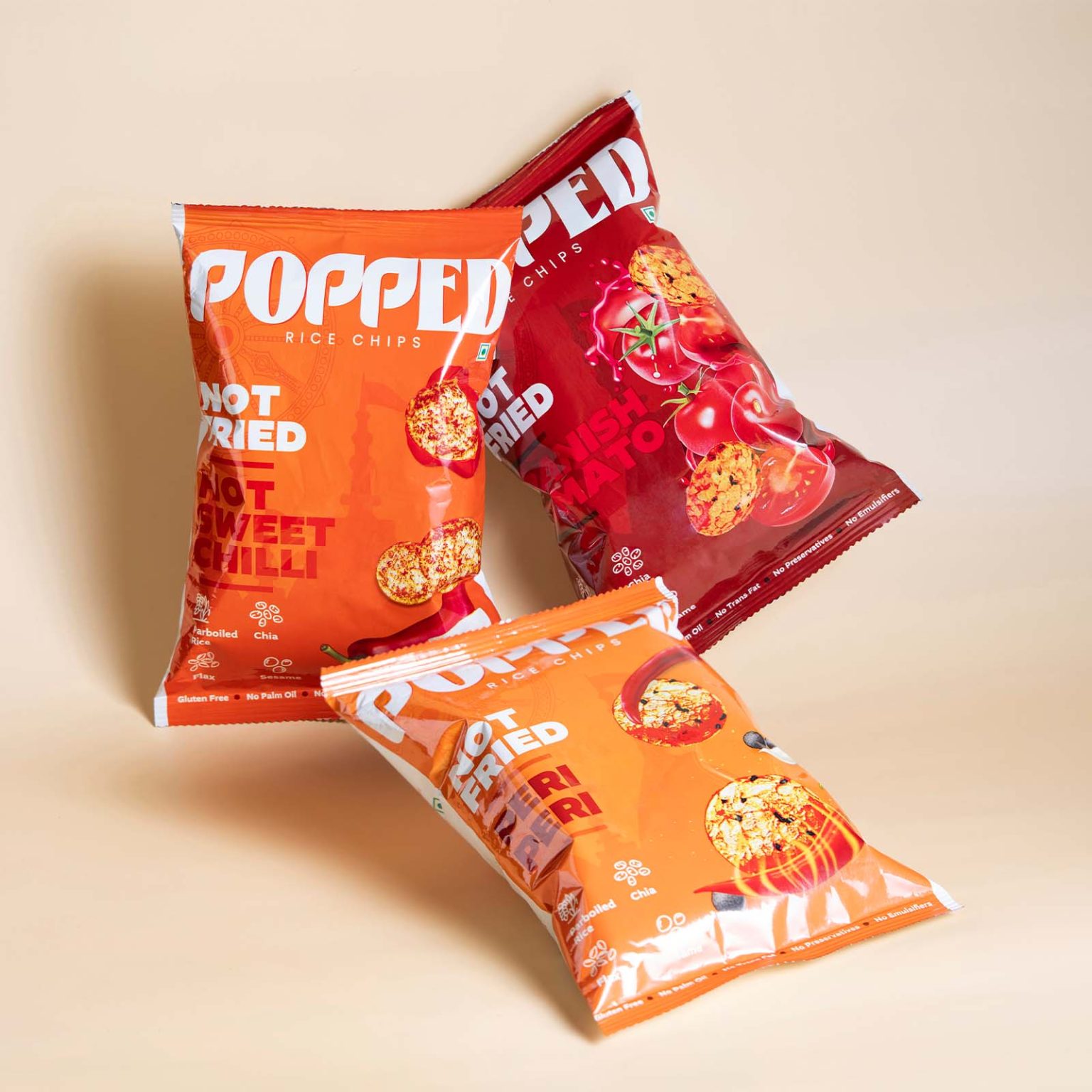 The Posaka Rice Chips packaging was conceptualized and designed to create a visually striking and emotionally resonant identity. Posaka is a snack brand offering parboiled air-popped rice chips made with wholesome ingredients like chia seeds, flax seeds, sesame, and parboiled rice. The goal was to reflect the brand’s ethos of innovation and indulgence while maintaining a connection to its natural and flavorful roots.