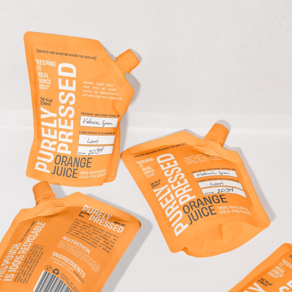 Purely Pressed needed a vibrant visual identity and packaging to highlight their natural, handcrafted, cold-pressed juices. The design emphasized wellness and sustainability, appealing to health-conscious consumers aged 18–40. By incorporating bold colours and a typo-graphic approach, alongside disruptive and innovative flex-packaging, the design stands out in a crowded market while showcasing its eco-friendly brand values.
