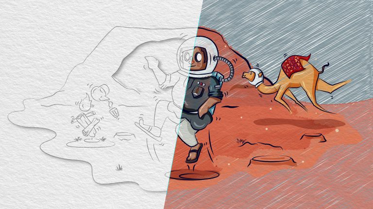 Our design brings this cosmic connection to life, featuring a Bedouin man in a space helmet, gracefully floating in zero gravity. Surrounding him are symbolic elements of Wadi Rum: the timeless camel, a traditional teapot evoking the warmth of desert hospitality, and the mesmerizing Moon Gate—a portal to infinite exploration.