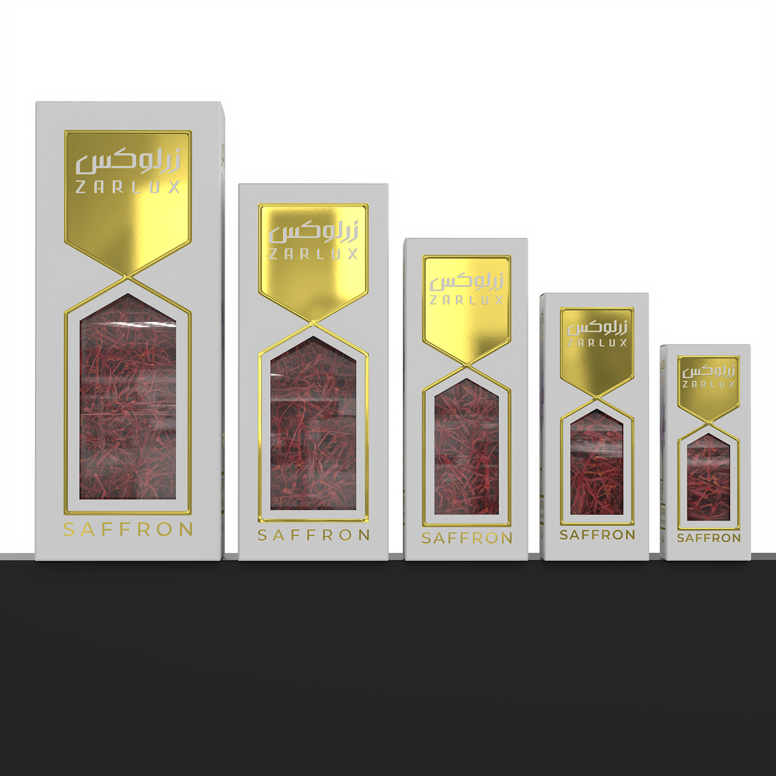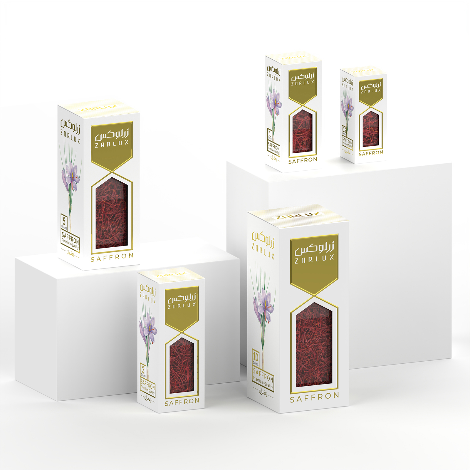 In the packaging design of Zarlux saffron, the emphasis is on simplicity and the utilization of saffron as the primary element in the design. The gold-embossing technique has been employed in key areas of the design, taking into consideration the brand name. Additionally, prominent embossed sections have been incorporated into the main face of the packaging.