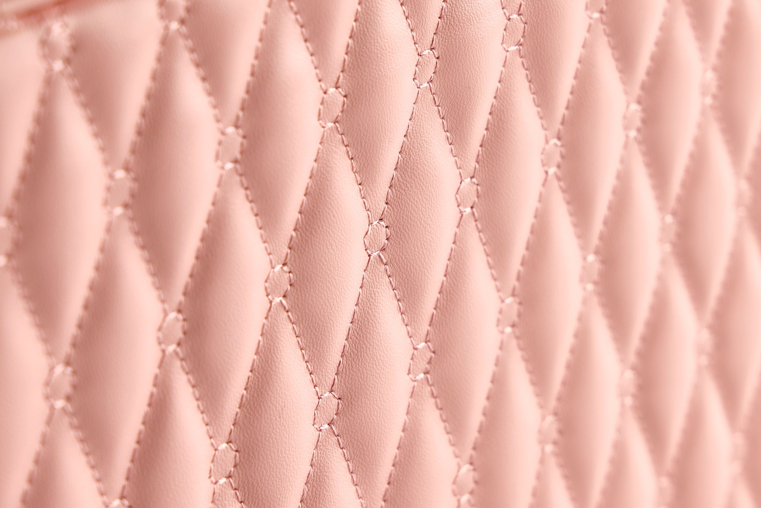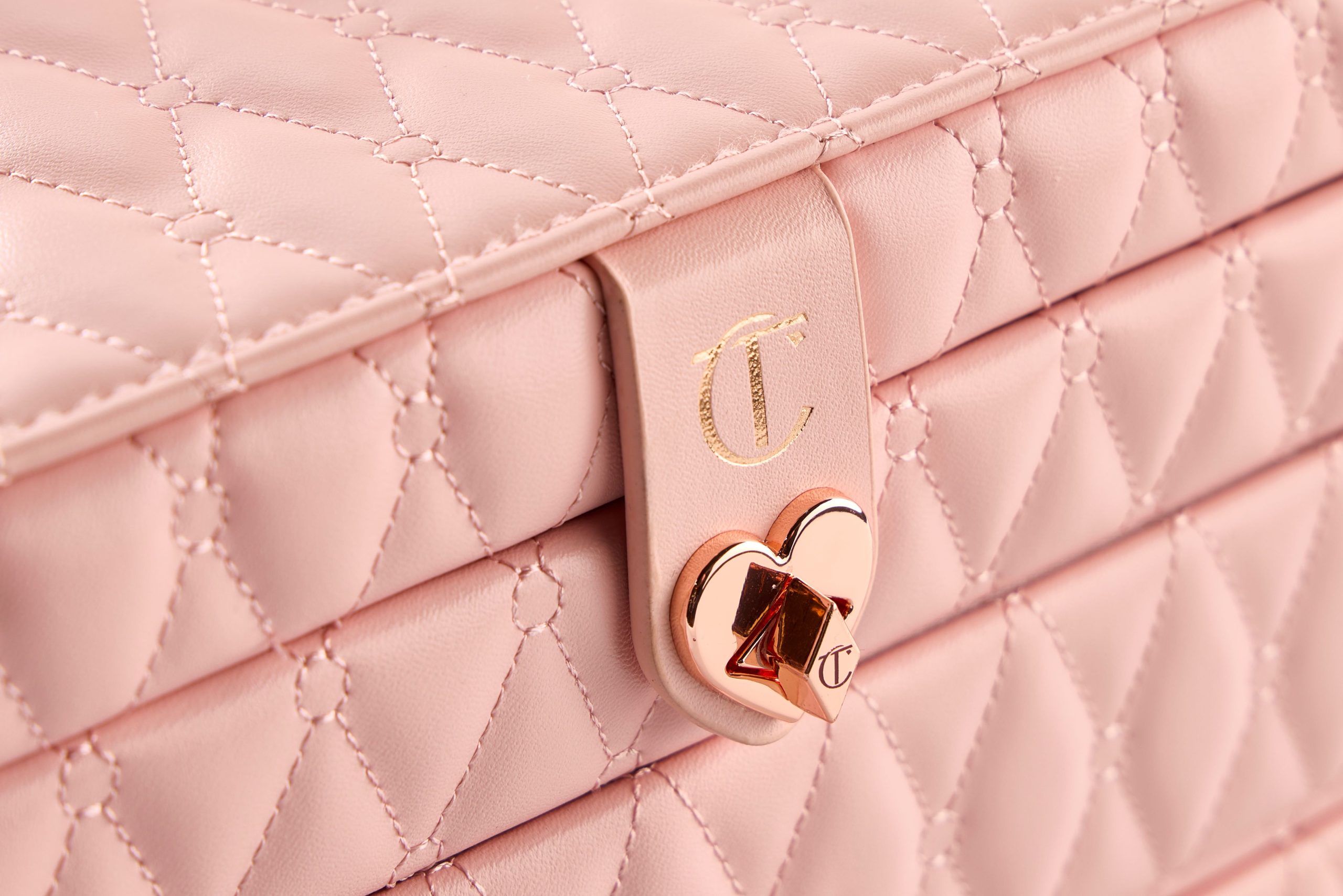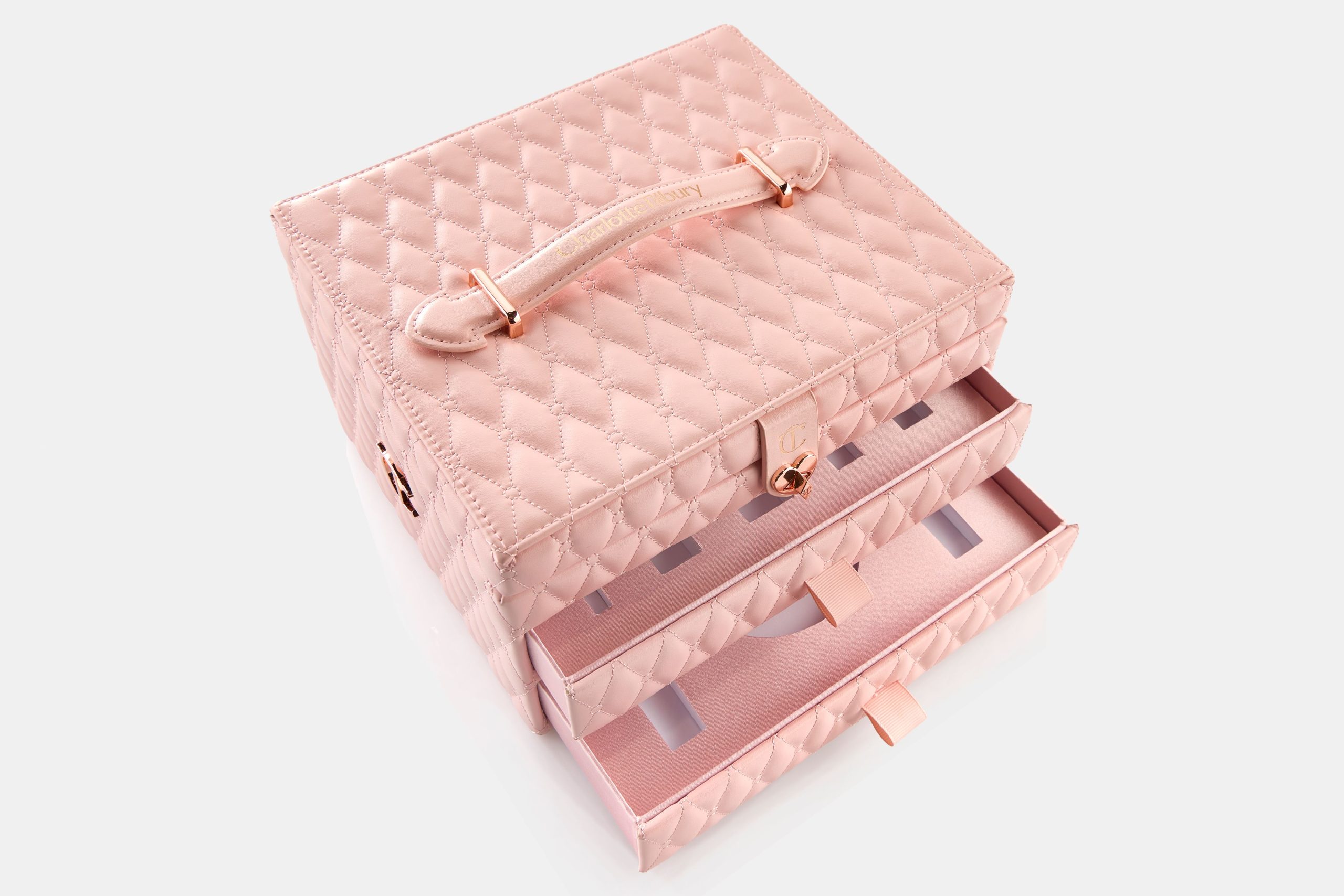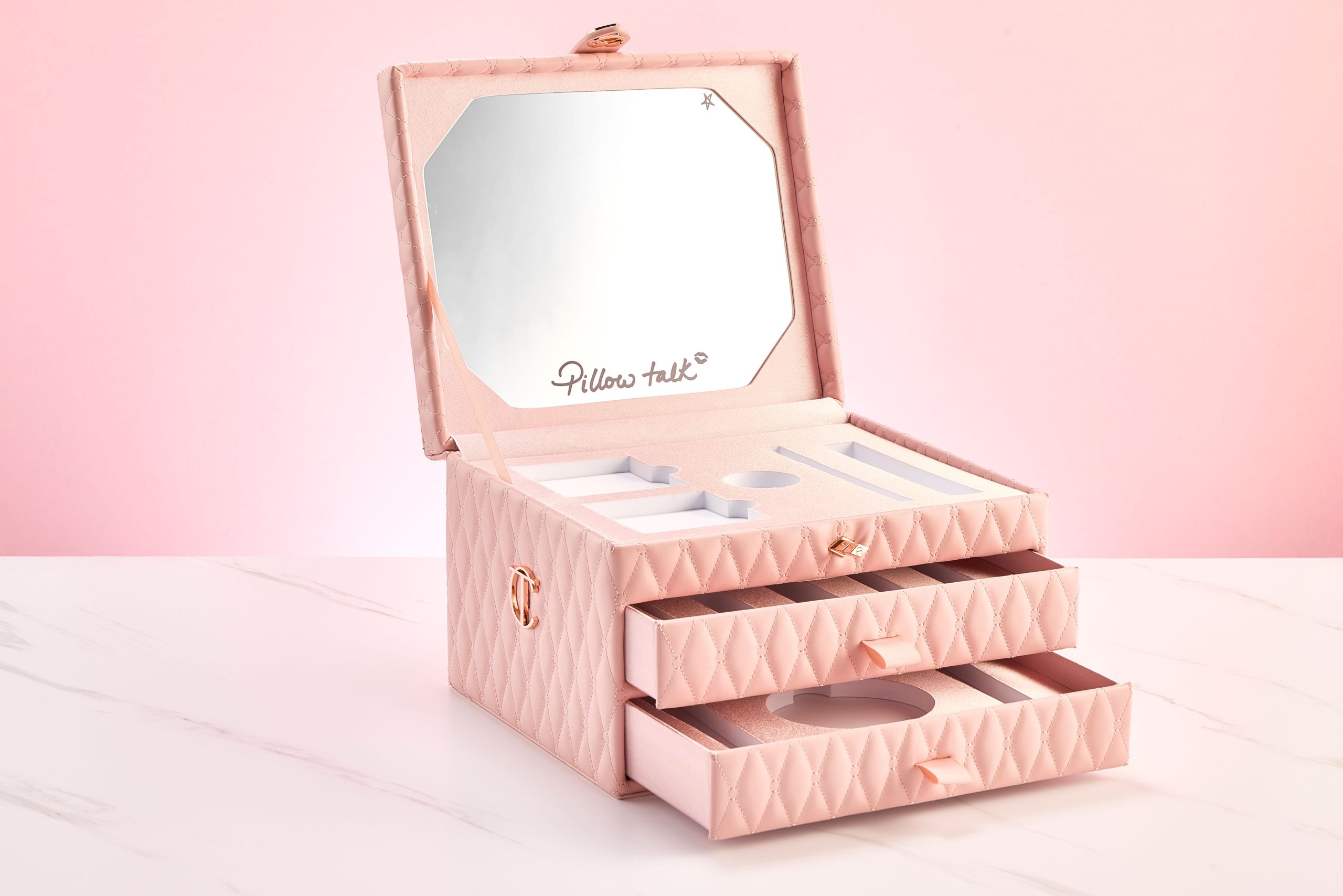 This was achieved by developing a vanity case with a classic Art Deco style structure – complete with an integrated mirror fixed to the underside of the lid – that was covered in an all-over quilted PU leather material, featuring the bespoke Pillow Talk signature diamond design, and coloured in a delicate nude-pink hue. In addition to reflecting the colours of the makeup products contained in the set, this colour also captured a subtly fashionable appearance that can be incorporated into a wide variety of décor styles if used as a display case.