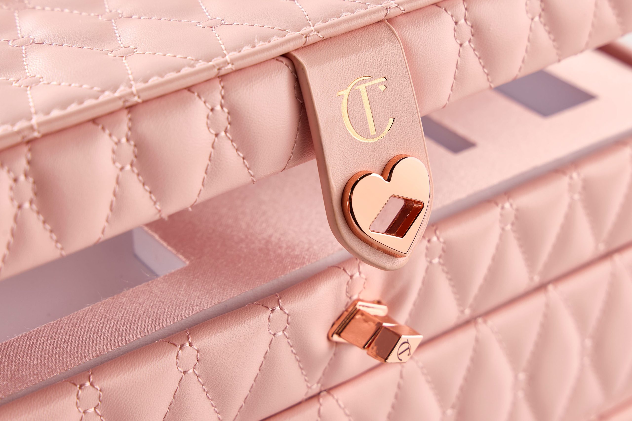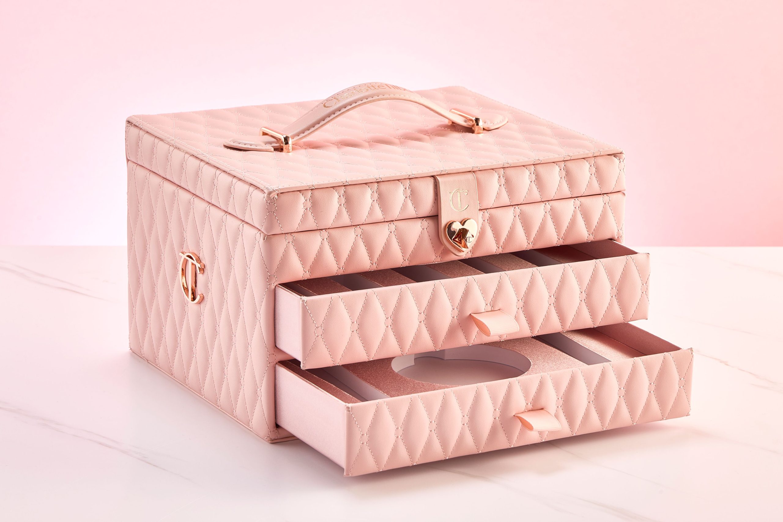 The lavish gift set contains 13 full-size nude-pink makeup products inside an elaborate chest, covered in quilted soft-touch nude-pink PU leather. It comes complete with a large mirror fitted to the inside of the lid, and two drawers featuring ribbon handles, colour matched to the pink satin material lining the case.