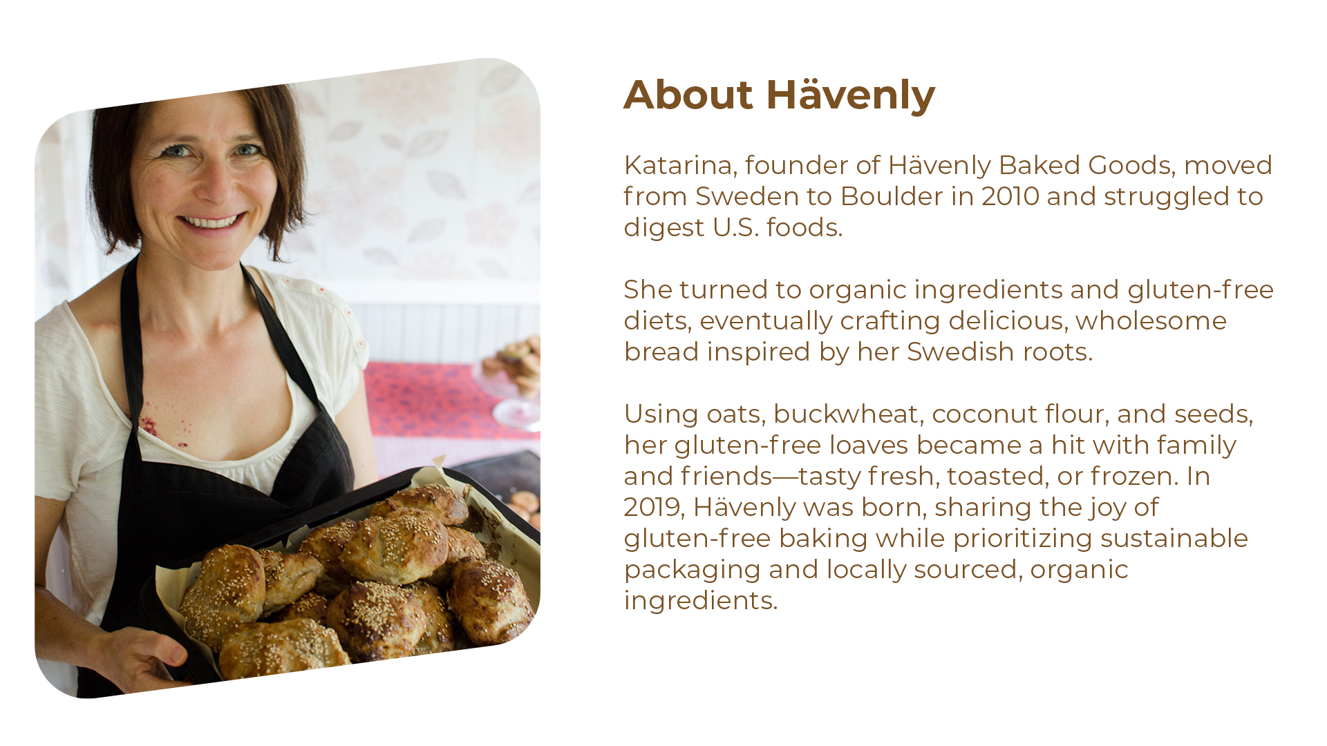 To her surprise, the bread tasted amazing right out of the oven as well as the following day. Occasionally, there were leftovers and Katarina would freeze the bread just to discover that it is delicious once thawed and tastes excellent when toasted. Following her passion,n Hävenly Baked Goods was born in 2019 in Boulder, CO. As she continues to explore new recipes, she spread the word that gluten free-bread can taste great and make you feel even better. Hävenly takes great care in using sustainable packaging and to source organic and locoal products as much as possible.